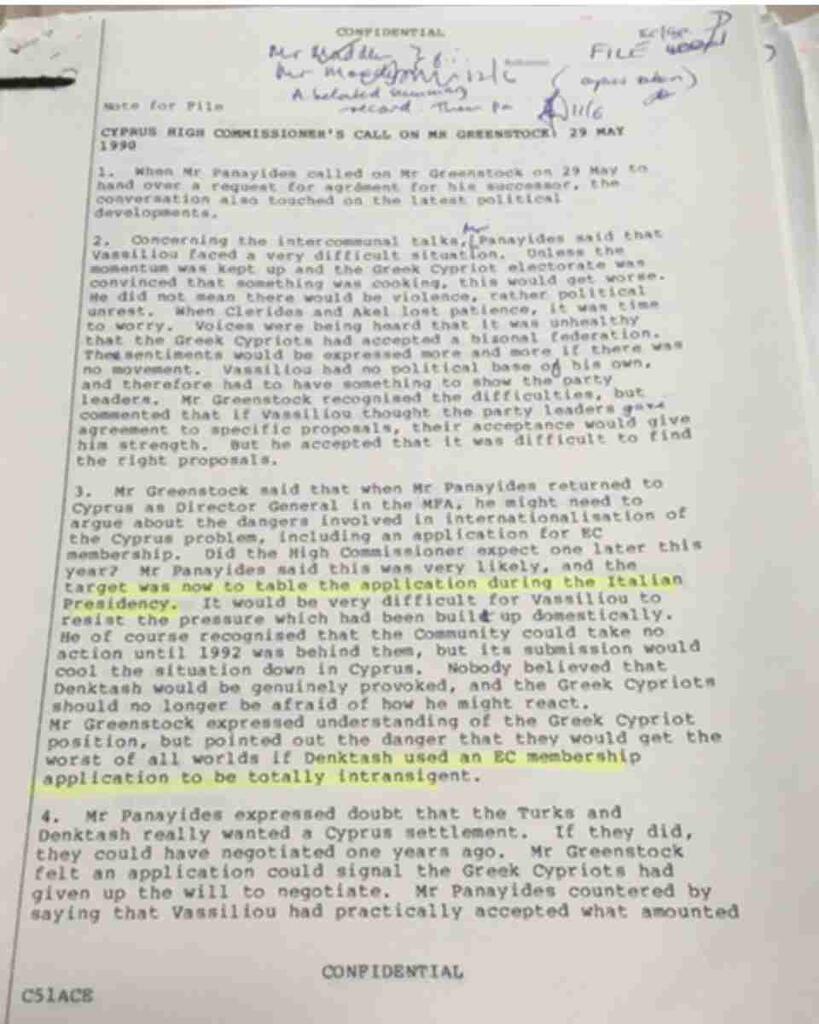 Αποκάλυψη Τάσου Παναγίδη, Υπ. Αρμοστή στο Λονδίνο (έγγρ. Φ.Ο. 11.6.1990), συζητώντας τις δυσκολίες που αντιμετώπιζε πια ο Γ. Βασιλείου με την αποδοχή τού 649/90 και την αίτηση ένταξης για την οποία οι Βρετανοί ήταν έντονα αντίθετοι: