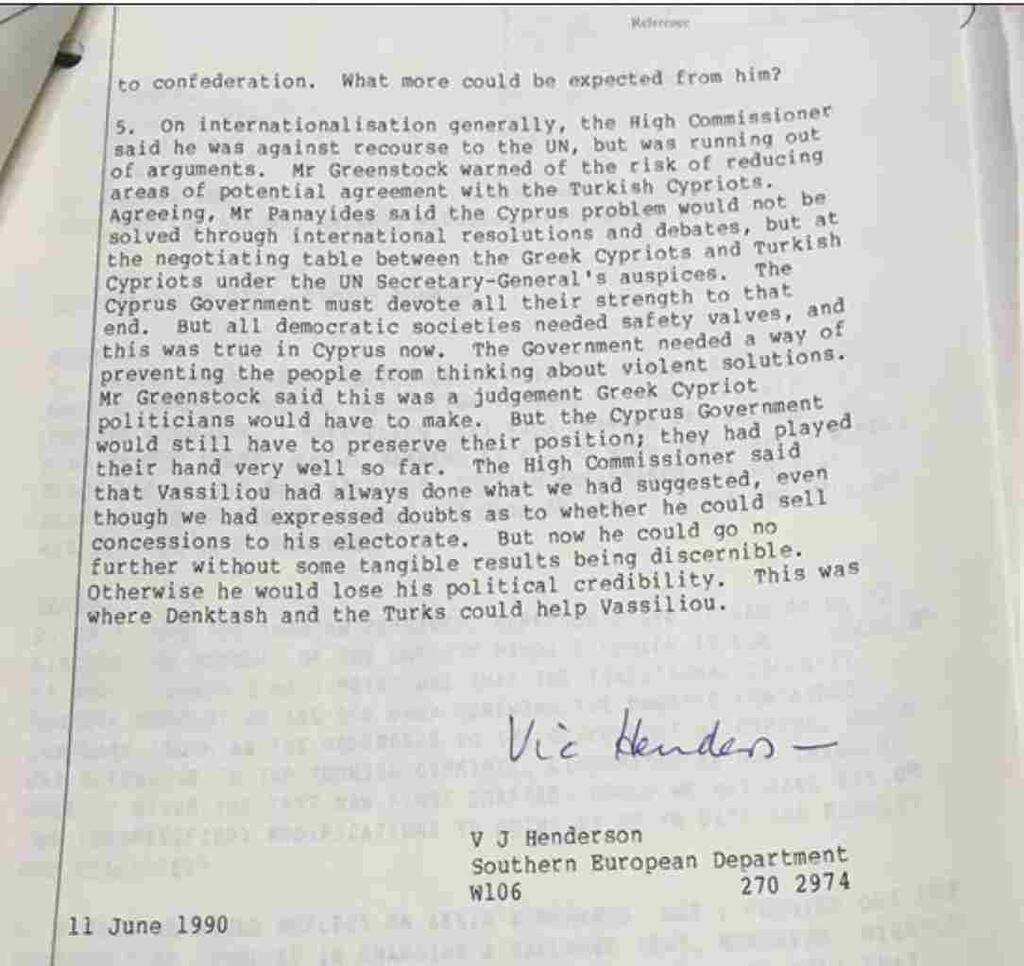 «Vasiliou has shown himself hugely more imaginative and courageous than his two predecessors as president. He represents a precious asset for us, both in his tolerance of our continued untroubled tenure of the bases and because he means to secure a settlement while he is in office…».