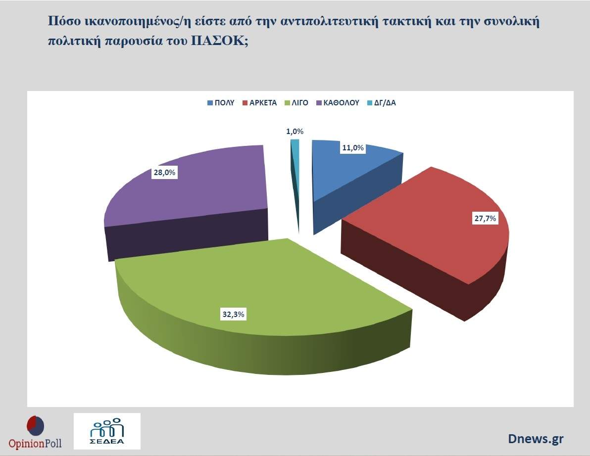 - Η πλειοψηφία των ψηφοφόρων του ΠΑΣΟΚ σε ποσοστό 60.3% δηλώνει λίγο ή και καθόλου ικανοποιημένο από την αντιπολιτευτική πολιτική του και την συνολική πολιτική παρουσία του ( 32.3% λίγο, 28% καθόλου) . Το 38.7% δηλώνει πολύ και αρκετά ικανοποιημένο.