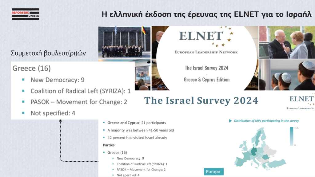 Νέα διασυνοριακή έρευνα του Reporters United που, ως καρπός διεθνούς συνεργασίας με εγνωσμένα μίντια από το εξωτερικό (Diasporist, TAZ και ND από τη Γερμανία, Intercept από τις ΗΠΑ και Mediapart από τη Γαλλία), καταγράφει σε Ελλάδα και Ευρώπη τα ίχνη της ELNET, της πιο σημαντικής -παρότι άγνωστης- οργάνωσης ισραηλινού λόμπι στη Γηραιά Ήπειρο. Πρόκειται για οντότητα προώθησης ισραηλινών κρατικών συμφερόντων που, ενώ μιλάει για «κοινές [με την Ευρώπη] δημοκρατικές αξίες», διαθέτει στους κόλπους της στελέχη τα οποία συνδέονται τόσο με την κυβέρνηση Νετανιάχου όσο και με ακροδεξιές οργανώσεις εποίκων στα κατεχόμενα παλαιστινιακά εδάφη.