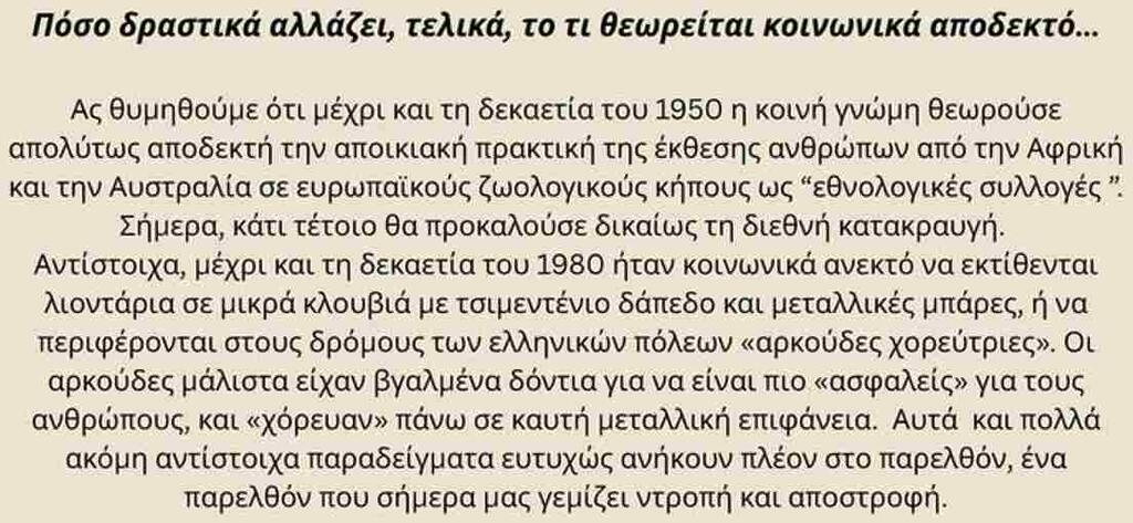 Ζούμε μια εποχή όπου επιδιώκουμε να αναθεωρήσουμε τους ηθικούς κανόνες και το νομικό πλαίσιο ώστε να προστατεύουμε καλύτερα τα ζώα και να τερματίζουμε πρακτικές κακοποίησης και εκμετάλλευσης, έστω και με καθυστέρηση δεκαετιών. Γιατί όμως είναι ακόμα αποδεκτό να βασανίζονται θαλάσσια θηλαστικά σε τσιμεντένιες δεξαμενές, σε χώρους που επισκέπτονται χιλιάδες άνθρωποι και κυρίως μαθητές σχολείων και οικογένειες με μικρά παιδιά, με οικονομικό αντίτιμο;