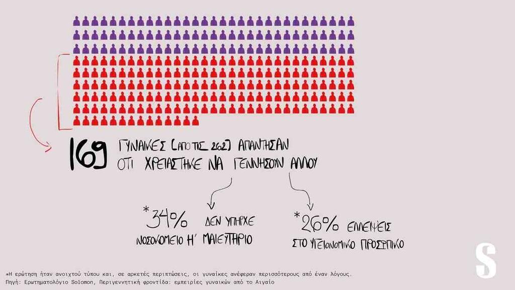 - Το 65% είπε πώς χρειάστηκε να γεννήσει αλλού, γιατί στο νησί δεν υπήρχε νοσοκομείο ή μαιευτική κλινική, οι υποδομές δεν ήταν επαρκείς, ή έλειπαν απαραίτητες ειδικότητες.