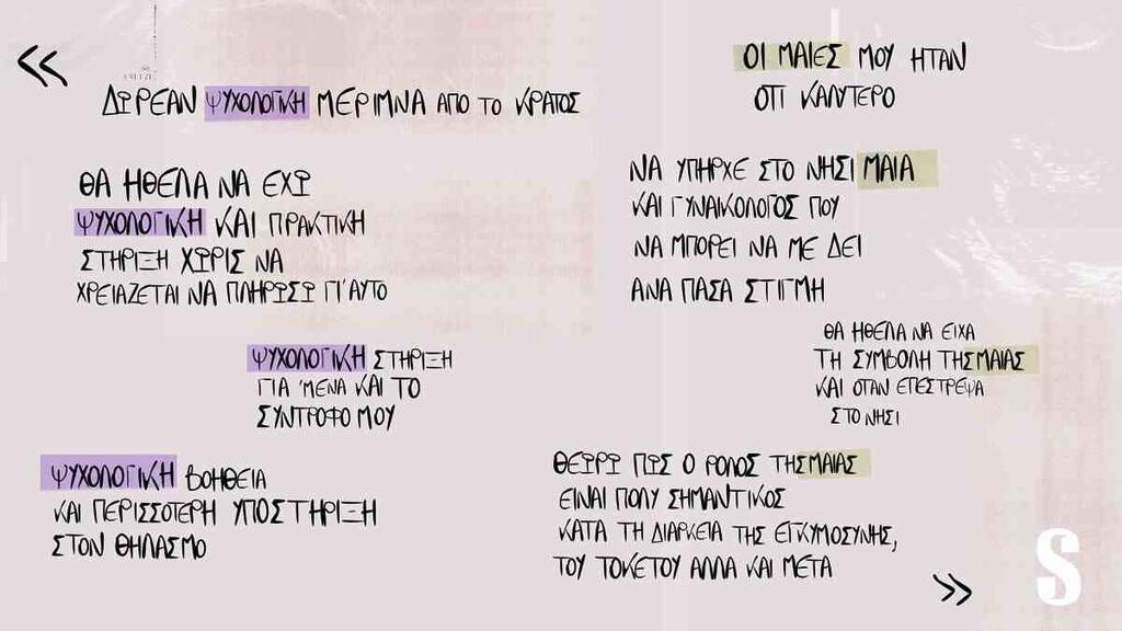 Στο ερωτηματολόγιο ρωτήσαμε τις συμμετέχουσες τι είδους βοήθεια θα ήθελαν κατά τη διάρκεια της εγκυμοσύνης, αλλά και μετά τον τοκετό. Τα δύο αιτήματα που προέκυπταν επανειλημμένα ήταν: (δωρεάν) ψυχολογική υποστήριξη και μαίες που θα βρίσκονται πιο σταθερά δίπλα τους κατά τη διάρκεια αυτής της περιόδου.