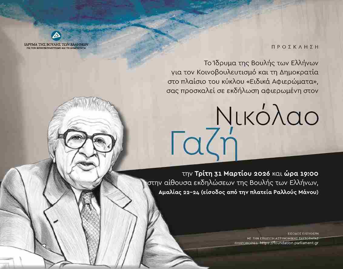 Το Ίδρυμα της Βουλής των Ελλήνων για τον Κοινοβουλευτισμό και τη Δημοκρατία στο πλαίσιο του κύκλου Ειδικά Αφιερώματα σας προσκαλεί σε εκδήλωση για τη ζωή και το έργο του Νικολάου Γαζήτην Τρίτη, 31 Μαρτίου 2026 και ώρα 19:00 στην αίθουσα εκδηλώσεων της Βουλή των Ελλήνων, Αμαλίας 22-24, είσοδος επί της πλατείας Ραλλούς Μάνου.