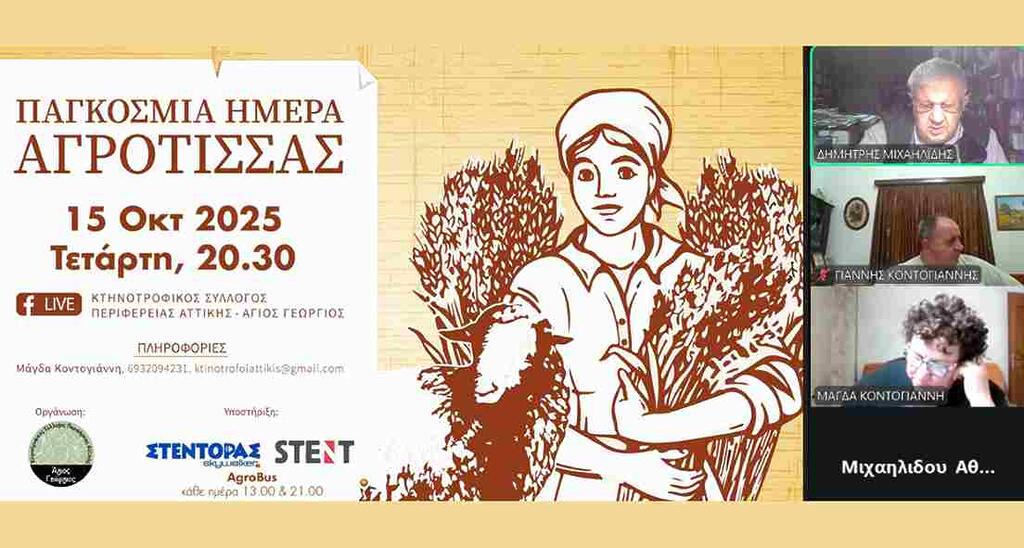4.Ο Κτηνοτροφικός Σύλλογος Περιφέρειας Αττικής προσκαλεί όλους και ιδιαίτερα όλες τις αγρότισσες, την Τετάρτη, 15 Οκτ 2025, στις 20.30 στην ανοικτή διαδικτυακή συνάντηση για τον «Αθέατο-αδήλωτο ρόλο της αγρότισσας» https://us02web.zoom.us/j/85789474307?pwd=0agWtbHdvfoXHwIsURgNJFuNhb49aq.1 & στο facebook (live). Η πρόσκληση είναι ανοιχτή, αλλά αξίζει να σταλθούν μερικές προσκλήσεις υπενθύμισης με φροντίδα της κας Μάγδας Κοντογιάννη.