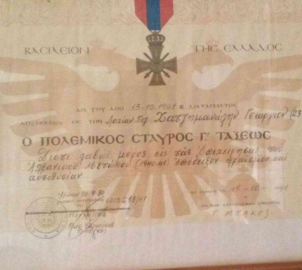 Μια μέρα ο παππάς του χωριού ανήγγειλε στην εκκλησιά πως μου δώκανε παράσημα για ανδραγαθεία. Η εντολή από το Υπουργείο Εθνικής Αμύνης ήταν ότι κάθε Κυριακή ο ιερέας έπρεπε να διαβάζει την ανακοίνωση στην εκκλησιά.