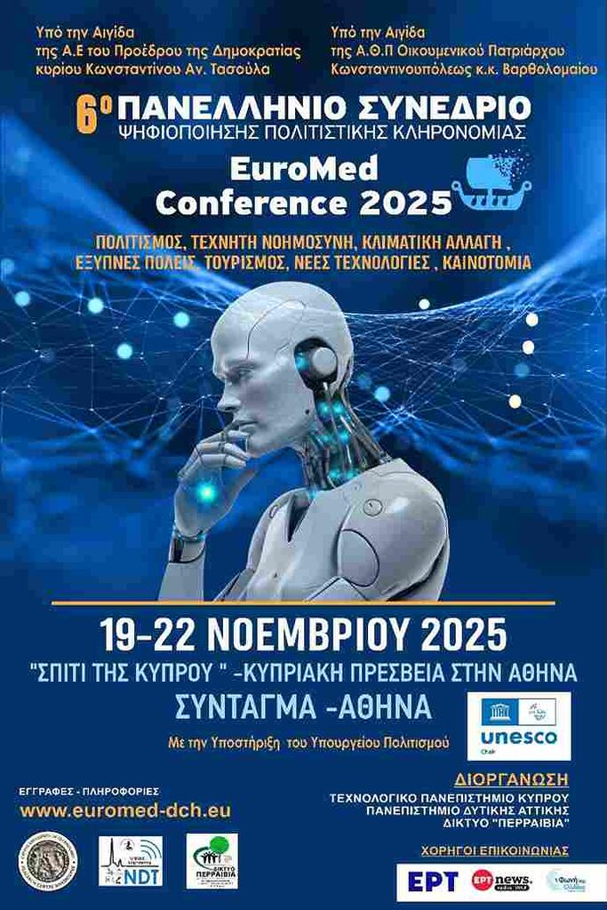 Με γρήγορους ρυθμούς γίνονται οι εγγραφές συνέδρων (https://conf.euromed-dch.eu/backend/enroll/el ), ενώ στην τελική ευθεία βρίσκεται η διοργάνωση του υβριδικού 6ου Πανελλήνιου Συνεδρίου Ψηφιοποίησης Πολιτιστικής Κληρονομιάς -EuroMed 2025 , που αποτελεί τη μεγάλη συνάντηση των Νέων Τεχνολογιών με την Πολιτιστική Κληρονομιά και έχει θεσμοθετηθεί και διοργανώνεται στην Ελλάδα, κάθε δύο (2) χρόνια, μετά από απόφαση των διοργανωτών Φορέων, που είναι: