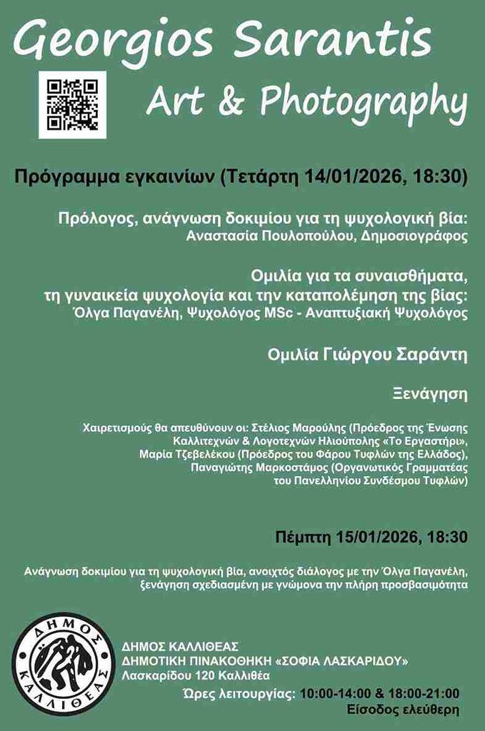 Η Δημοτική Πινακοθήκη Καλλιθέας Αττικής “Σοφία Λασκαρίδου” ετοιμάζεται να φιλοξενήσει μια έκθεση που δεν περιορίζεται μόνο στην απλή προβολή έργων, αλλά συνιστά μια ζωντανή, ξεχωριστή εμπειρία και αφήγηση ψυχής. Ο Γιώργος Σαράντης επιστρέφει με την ατομική του έκθεση Συναισθηματολόγιον, που θα πραγματοποιηθεί από τις 12 έως τις 16 Ιανουαρίου 2026 (ώρες λειτουργίας: 10:00-14:00 & 18:00-21:00, είσοδος ελεύθερη).