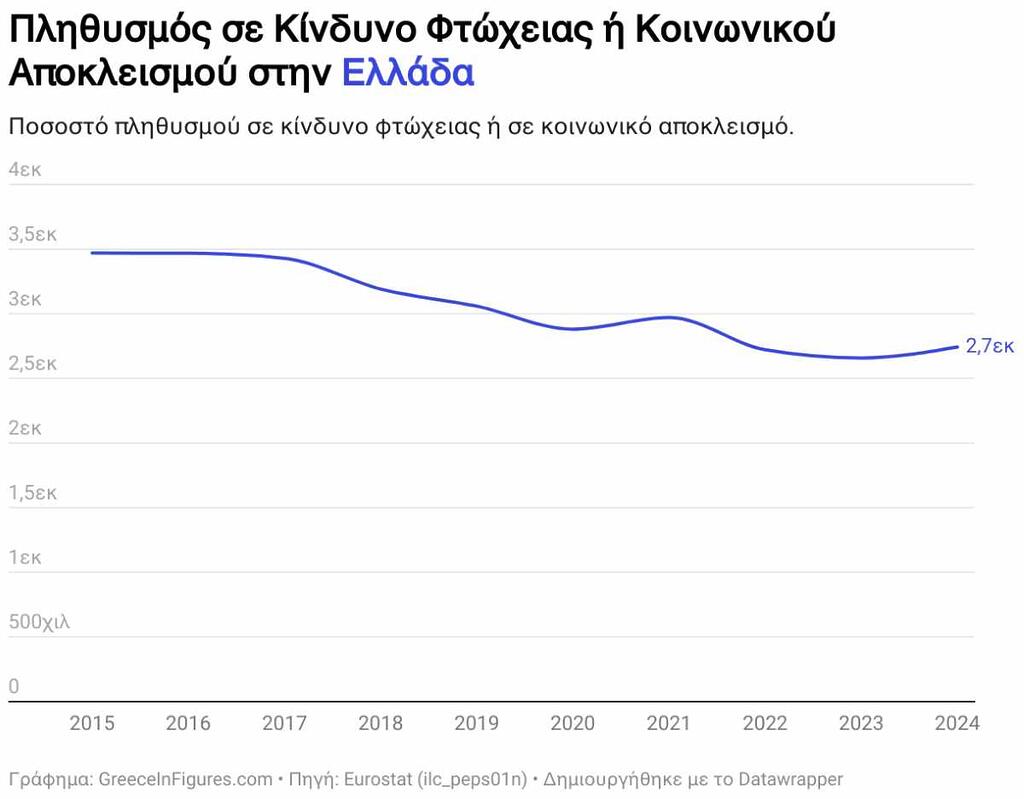Από το 2015 έως το 2024, ο αριθμός των Ελλήνων που βρίσκονται σε κίνδυνο φτώχειας ή κοινωνικού αποκλεισμού μειώθηκε από περίπου 3,47 εκατομμύρια σε 2,74 εκατομμύρια, καταγράφοντας σημαντική πτώση κατά τη διάρκεια της δεκαετίας, παρά τις μικρές αυξομειώσεις σε ορισμένα έτη.