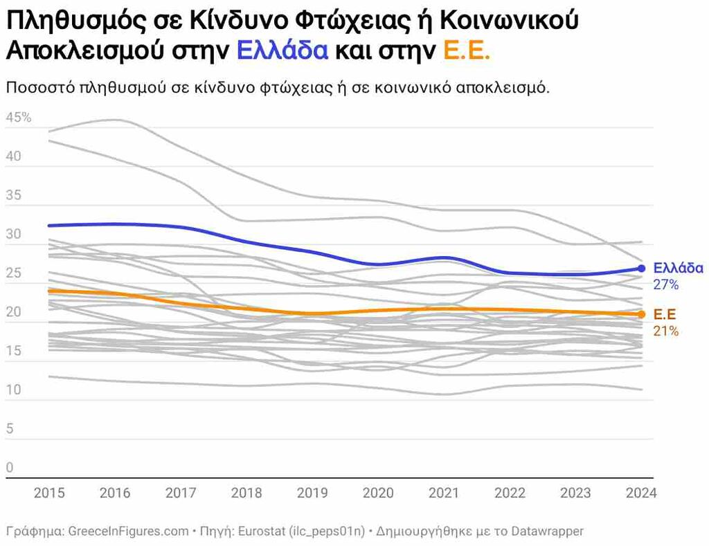 Από το 2015 έως το 2024, το ποσοστό των Ελλήνων που βρίσκονται σε κίνδυνο φτώχειας ή κοινωνικού αποκλεισμού ακολουθεί συνολικά πτωτική πορεία, παρά τις επιμέρους διακυμάνσεις. Το 2015, το 32,4% των Ελλήνων βρισκόταν σε τέτοιες συνθήκες, ενώ το 2024 το ποσοστό ανέρχεται στο 26,9%, καταγράφοντας μείωση περίπου 5,5 ποσοστιαίων μονάδων σε βάθος δεκαετίας.