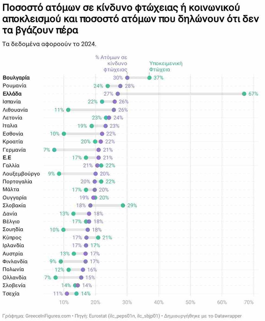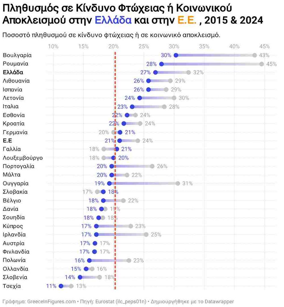 Το 2024, η Ελλάδα κατατάσσεται στην τρίτη υψηλότερη θέση στην Ευρωπαϊκή Ένωση ως προς το ποσοστό του πληθυσμού που ζει σε κίνδυνο φτώχειας ή κοινωνικού αποκλεισμού, με 27%. Πρώτη στην κατάταξη βρίσκεται η Βουλγαρία με 30%, ενώ ακολουθεί η Ρουμανία με 28%. Αξίζει, ωστόσο, να σημειωθεί ότι και οι δύο αυτές χώρες παρουσίασαν τη μεγαλύτερη βελτίωση την τελευταία δεκαετία, καθώς το 2015 τα ποσοστά τους ξεπερνούσαν το 43%.