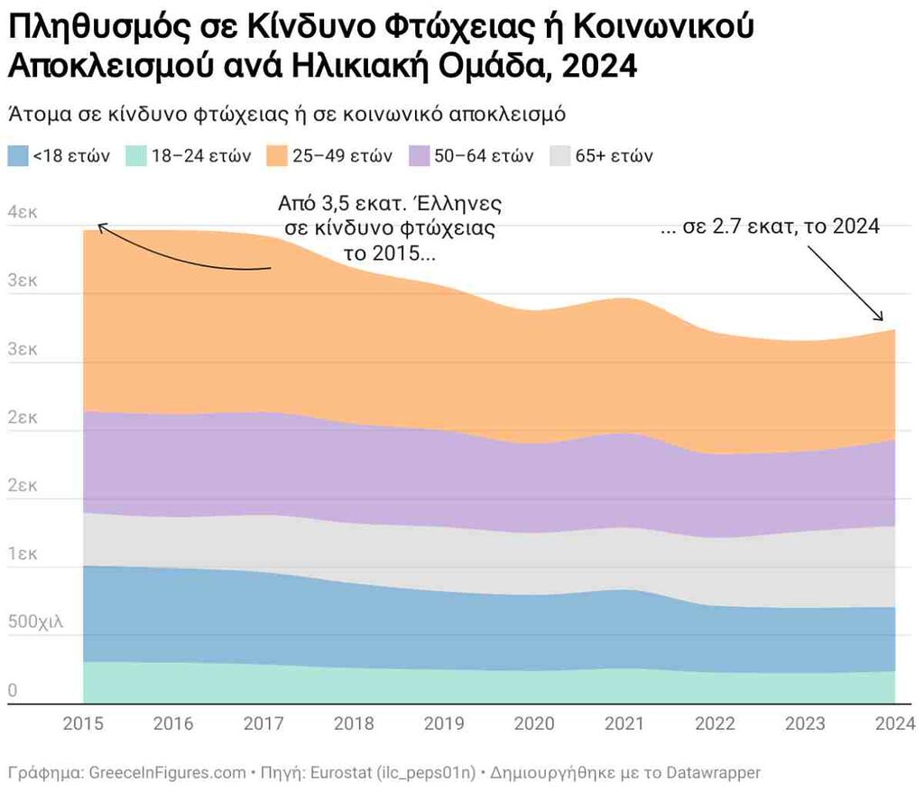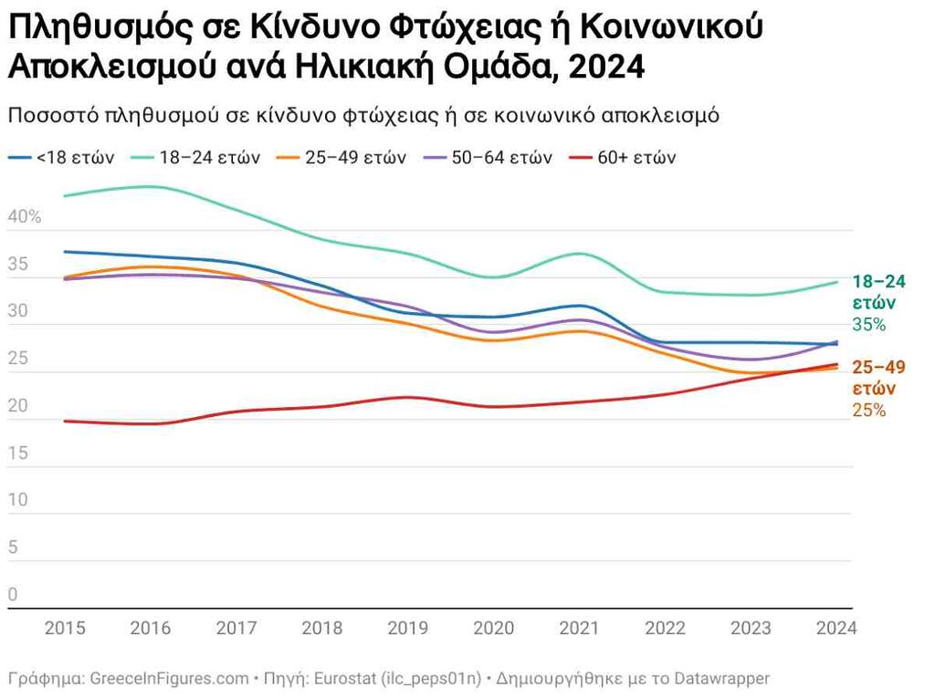 Στις ηλικίες 25–49 ετών παρατηρείται σαφής μείωση, από 35,0% σε 25,4%, ενώ η ομάδα 50–64 ετών ακολούθησε παρόμοια πτωτική πορεία, φτάνοντας από 34,8% σε 28,2%. Στην ηλικιακή ομάδα των 60+ ετών, η Ελλάδα εμφανίζει σταδιακή αύξηση του ποσοστού του πληθυσμού σε κίνδυνο φτώχειας ή κοινωνικού αποκλεισμού, από 19,8% το 2015 σε 25,8% το 2024. Αντίθετα, ο ευρωπαϊκός μέσος όρος παραμένει σχετικά σταθερός γύρω στο 20%, χωρίς σημαντικές αυξομειώσεις. Αυτό υποδηλώνει ότι οι ηλικιωμένοι στην Ελλάδα γίνονται διαρκώς πιο ευάλωτοι σε σχέση με τον ευρωπαϊκό μέσο όρο, καθιστώντας την κοινωνική προστασία και τις πολιτικές συντάξεων κρίσιμη προτεραιότητα για αυτή την ομάδα.