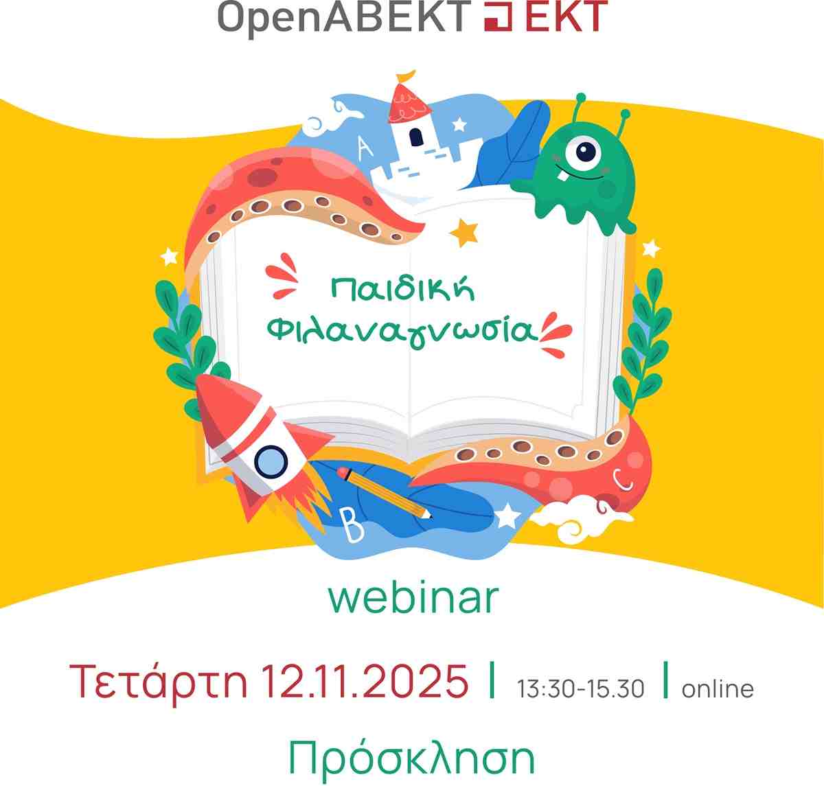 Η ομάδα του openΑΒΕΚΤ σας προσκαλεί να παρακολουθήσετε το webinar “Παιδική φιλαναγνωσία: Πώς οι βιβλιοθήκες προσεγγίζουν τους νέους αναγνώστες”, που θα πραγματοποιηθεί την Τετάρτη 12 Νοεμβρίου, 13:30-15:30.