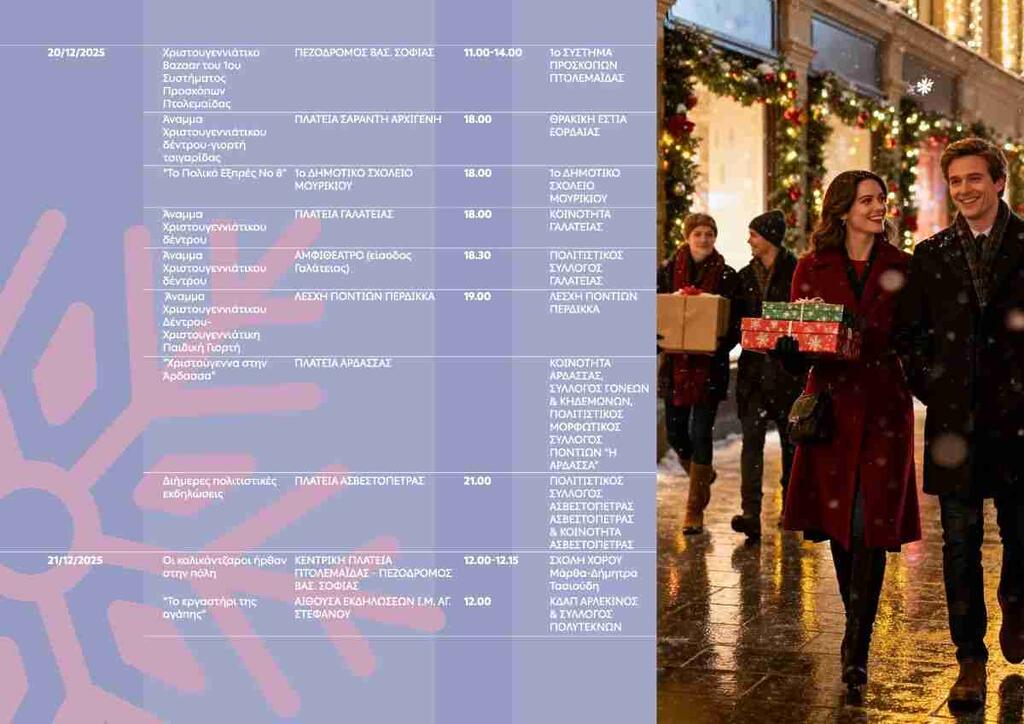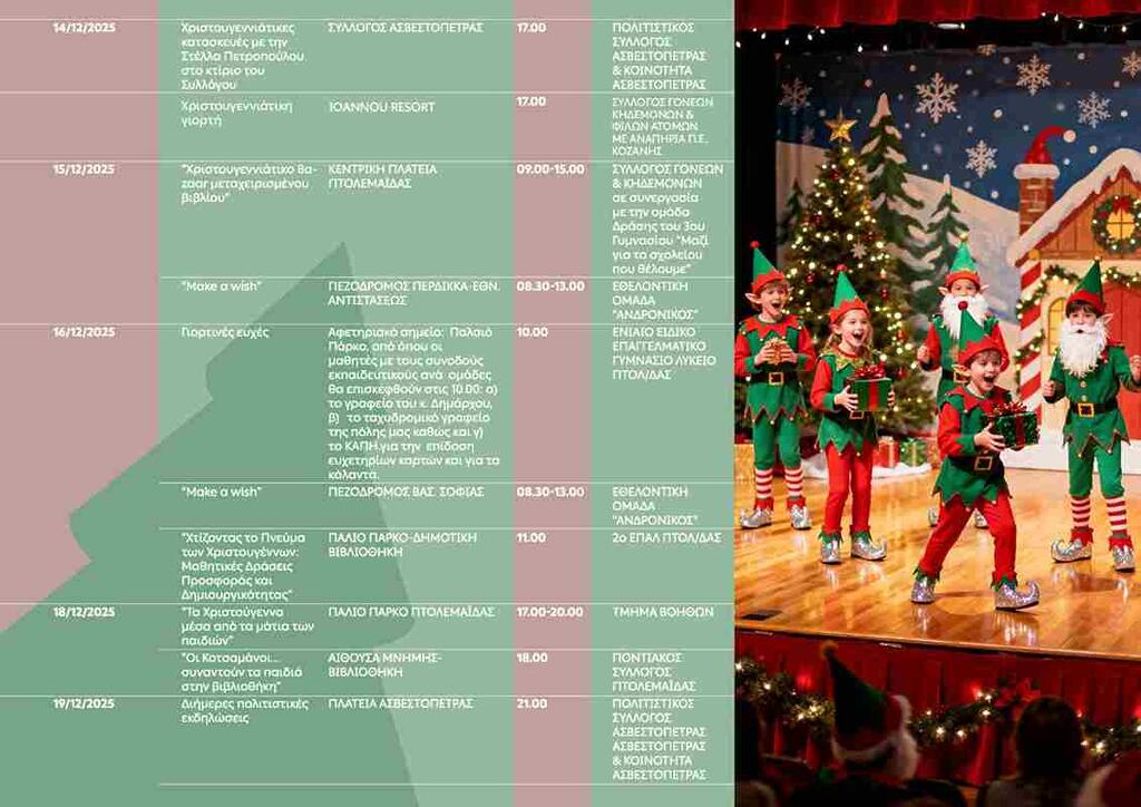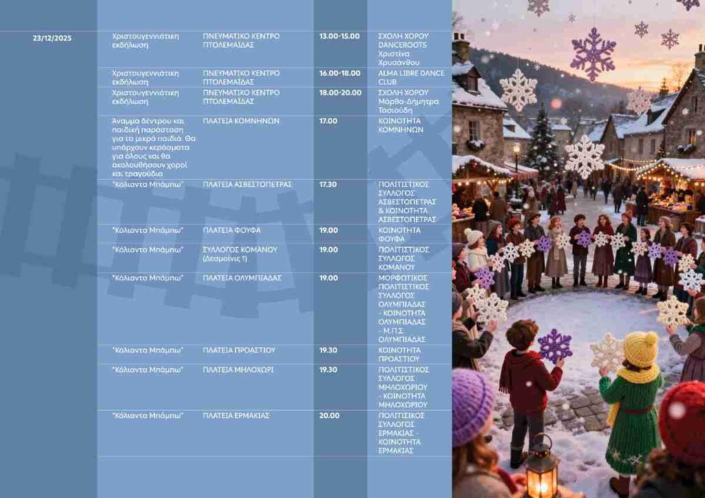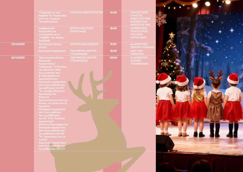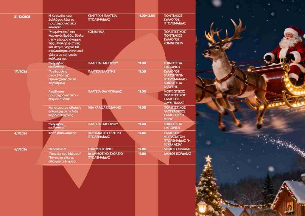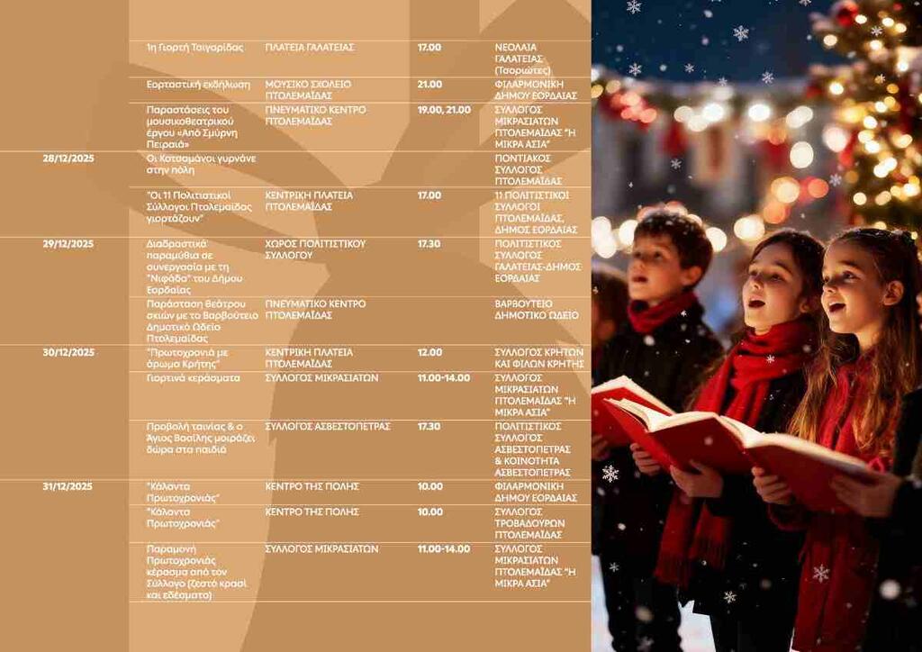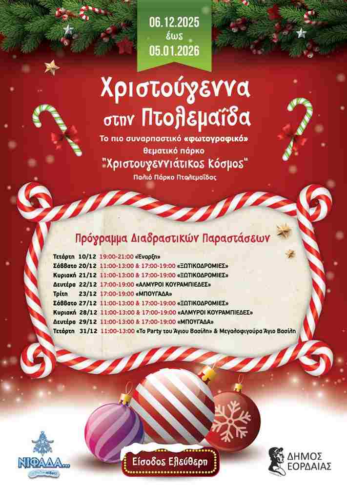 - Στον πυρήνα του φετινού προγράμματος βρίσκεται το θεματικό πάρκο «Χριστουγεννιάτικος Κόσμος», στο Παλαιό Πάρκο Πτολεμαΐδας, το οποίο θα λειτουργεί από 6 Δεκεμβρίου 2025 έως και 5 Ιανουαρίου 2026, με ελεύθερη είσοδο.
