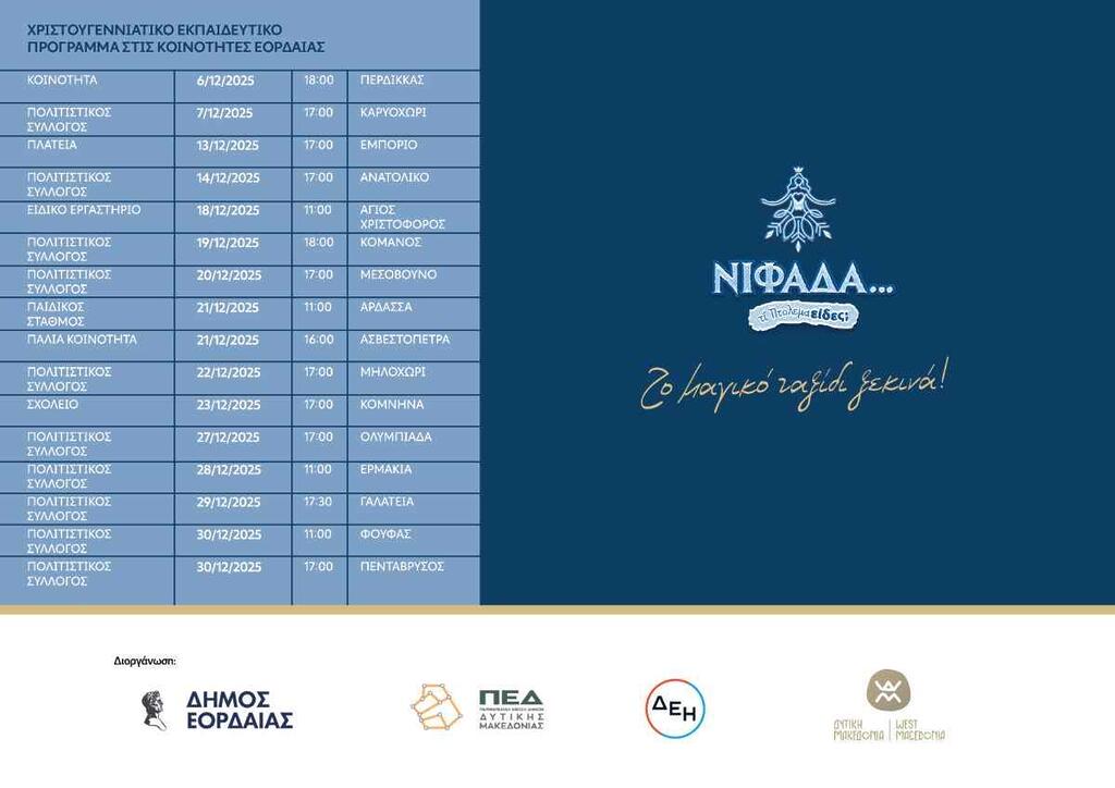 Συνολικά, το πρόγραμμα «Νιφάδα» περιλαμβάνει δεκάδες εκδηλώσεις σε πλατείες, σχολεία, κοινότητες και πολιτιστικούς χώρους του Δήμου Εορδαίας: αναμμένα χριστουγεννιάτικα δέντρα, θεατρικά και μουσικά δρώμενα, γιορτινά bazaar, διαδρομές με το τρενάκι της πόλης και αναβιώσεις τοπικών εθίμων.