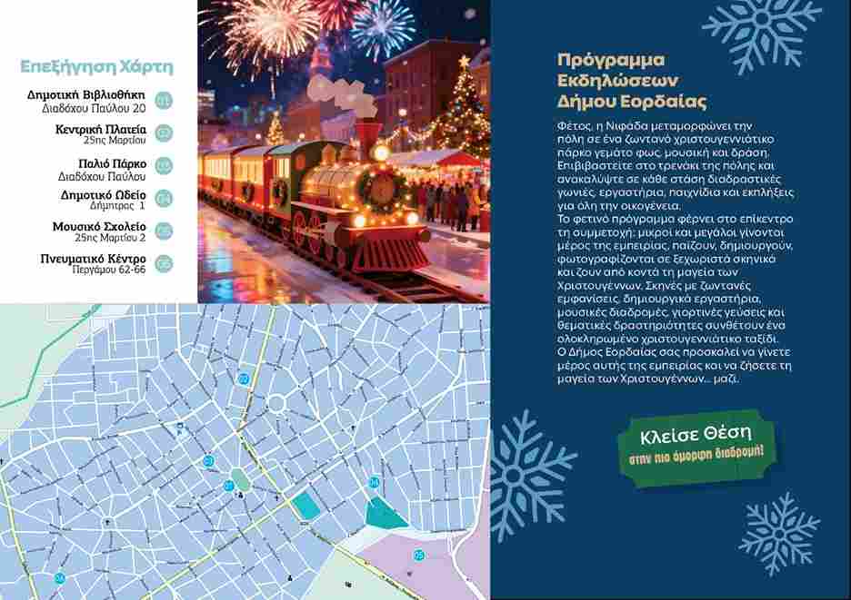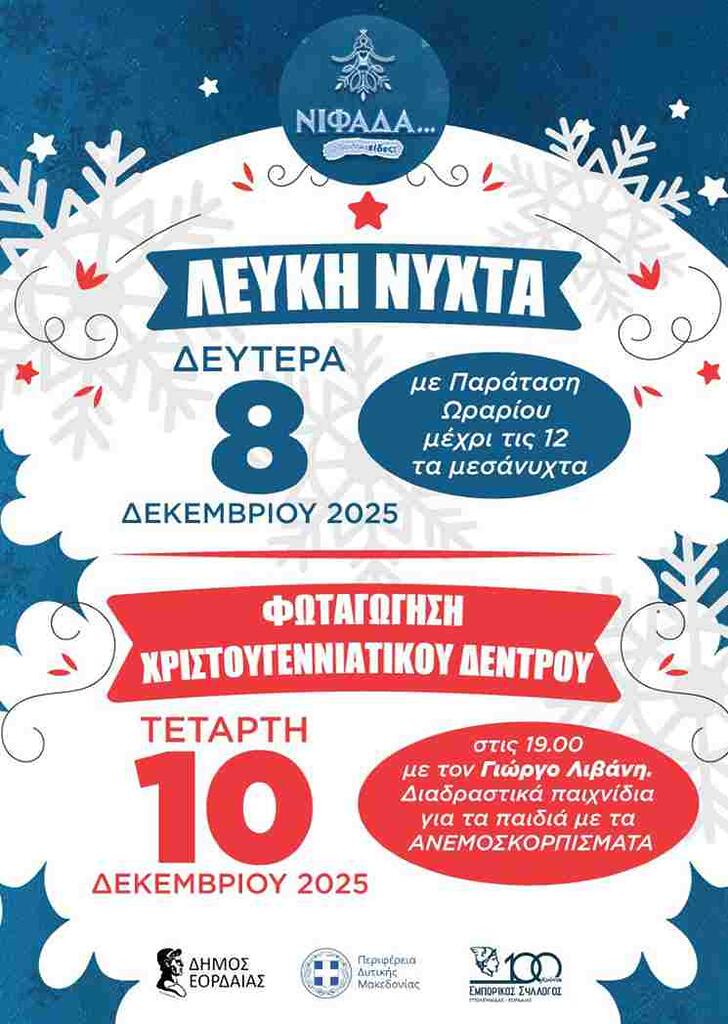 Ο Δήμος Εορδαίας και ο Εμπορικός Σύλλογος Πτολεμαΐδας καλούν όλους τους πολίτες, τους συλλόγους και τους επαγγελματίες να αγκαλιάσουν τις δράσεις της «Νιφάδας», να γεμίσουν τις πλατείες με φως, τις γειτονιές με μουσικές και την αγορά με ζωή, αποδεικνύοντας ότι η Εορδαία μπορεί να γράφει τις δικές της γιορτινές ιστορίες, με συνεργασία, σχέδιο και σεβασμό στην παράδοσή της.