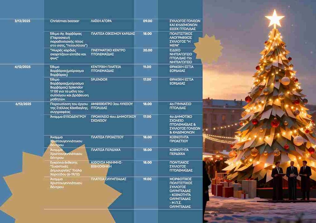 - Την Τετάρτη 10 Δεκεμβρίου 2025, στις 19:00, στην κεντρική πλατεία Πτολεμαΐδας, ο Δήμος Εορδαίας προσκαλεί μικρούς και μεγάλους στη φωταγώγηση του χριστουγεννιάτικου δέντρου.