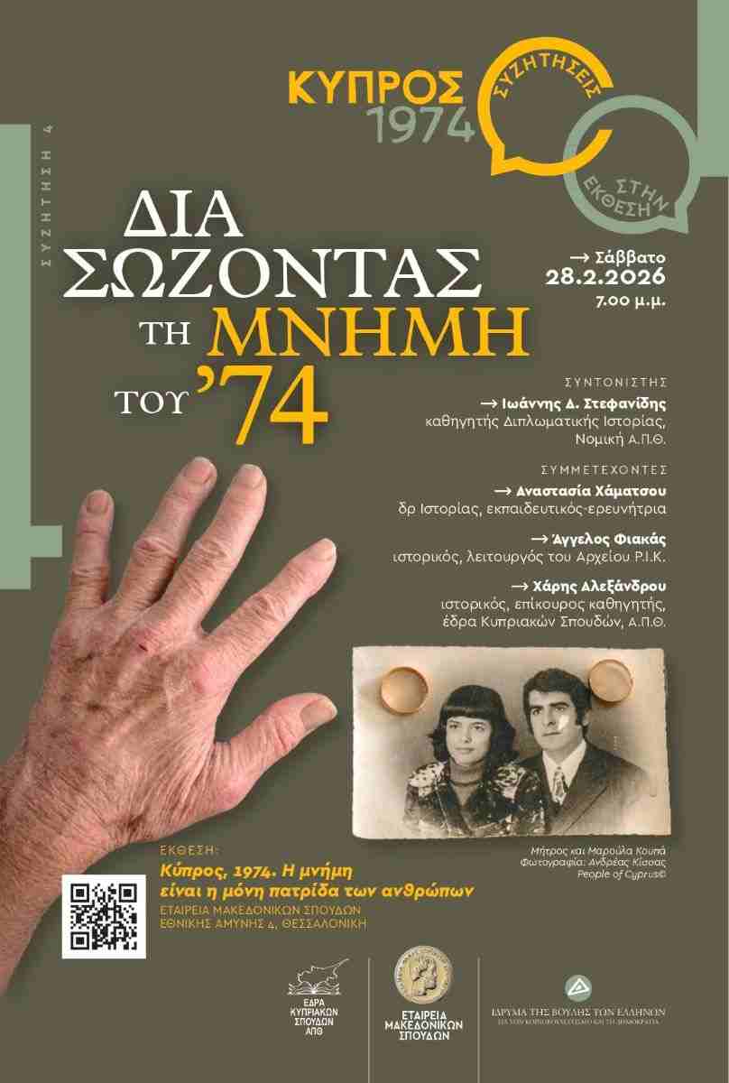 Το Ίδρυμα της Βουλής των Ελλήνων για τον Κοινοβουλευτισμό και τη Δημοκρατία, στο πλαίσιο της έκθεσης «Κύπρος 1974. Η μνήμη είναι η μόνη πατρίδα των ανθρώπων», οργάνωσε σειρά εκδηλώσεων με τίτλο «Συζητήσεις στην έκθεση» στο πρώην Δημόσιο Καπνεργοστάσιο. Η πρώτη εκδήλωση του κύκλου ήταν αφιερωμένη στους αγνοούμενους του 1974. Η δεύτερη εκδήλωση-συζήτηση διερεύνησε τη σημασία της λογοτεχνίας στη διαχείριση του τραύματος, ατομικά και συλλογικά. Η τρίτη εκδήλωση ολοκλήρωσε τον κύκλο συζητήσεων με θέμα «Προστασία της κυπριακής πολιτιστικής κληρονομιάς: αρχαιοκαπηλία, επαναπατρισμοί, το παρόν και το μέλλον των μνημείων». Η σειρά συνεχίζει με την τέταρτη συζήτηση που θα πραγματοποιηθεί το Σάββατο 28 Φεβρουαρίου 2026, στις 19:00, στην Εταιρεία Μακεδονικών Σπουδών. Θα αναδειχθούν ζητήματα που αφορούν τη διαχείριση της μνήμης του 1974, εστιάζοντας στη σημασία της στο ατομικό, συλλογικό και θεσμικό επίπεδο. Συνομιλητές στην συνάντηση θα είναι η δρ. Ιστορίας και ερευνήτρια Αναστασία Χάματσου, ο ιστορικός, λειτουργός του Αρχείου ΡΙΚ Άγγελος Φιακάς και ο ιστορικός, επίκουρος καθηγητής της έδρας Κυπριακών Σπουδών στο Αριστοτέλειο Πανεπιστήμιο Θεσσαλονίκης Χάρης Αλεξάνδρου. Τη συζήτηση θα συντονίσει ο καθηγητής Ιστορίας του Αριστοτελείου Πανεπιστημίου Θεσσαλονίκης Γιάννης Στεφανίδης. Η εκδήλωση ολοκληρώνει την έκθεση στη Θεσσαλονίκη. Η έκθεση «Κύπρος, 1945. Η μνήμη είναι η μόνη πατρίδα των ανθρώπων» θα ταξιδέψει τον Μάρτιο στη Ρόδο, στο Μουσείο Νεοελληνικής Τέχνης.