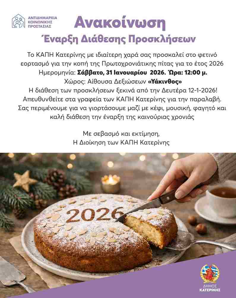HomeΠΙΕΡΙΑΈναρξη διάθεσης προσκλήσεων για την εκδήλωση (Σάββατο 31 Ιανουαρίου) κοπής της πίτας του ΚΑΠΗ για το 2026 Έναρξη διάθεσης προσκλήσεων για την εκδήλωση (Σάββατο 31 Ιανουαρίου) κοπής της πίτας του ΚΑΠΗ για το 2026 12 Ιανουαρίου 202612 Ιανουαρίου 2026Ο Διάλογος Ο ΔιάλογοςΟμάδα Σύνταξης at Ο Διάλογος | [email protected] | Website | + postsBio ⮌Ο ΔιάλογοςΚοπή πίτας, διοριστήρια και ευχές για τη νέα χρονιά από την Ιερά Μητρόπολη Κίτρους, Κατερίνης και ΠλαταμώνοςΟ ΔιάλογοςΔιαδικτυακό σεμινάριο Ε.Ε.Α.: «Το Ελληνικό Κρασί στο Τραπέζι της Εστίασης» – Τρίτη 20/1/2026Ο ΔιάλογοςΔήμος Κατερίνης: Θερμαινόμενος χώρος για την προστασία ευπαθών κοινωνικών ομάδωνΟ ΔιάλογοςΠροβολή της Πιερίας στο ταξιδιωτικό περιοδικό της δανέζικης εφημερίδας «Politiken»