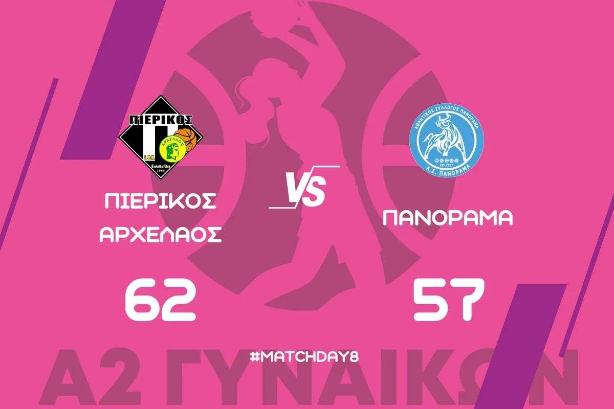 Ο Πιερικός Αρχέλαος επικράτησε με 62-57 επί του Πανοράματος στο Κλειστό Γυμναστήριο Σιδηροδρομικού Σταθμού Κατερίνης σε αγώνα για την 8η αγωνιστική του 2ου ομίλου της Α2 Εθνικής Κατηγορίας Γυναικών.
