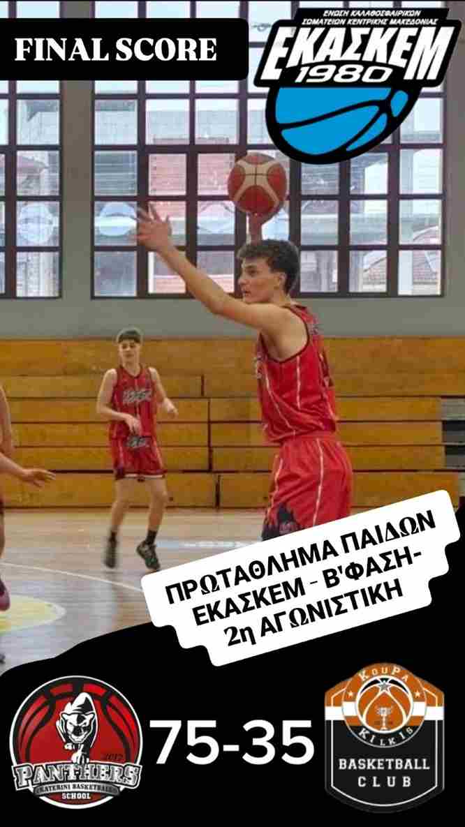 Μια ακόμη εξαιρετική εμφάνιση, πραγματοποίησαν οι Παίδες των Πανθήρων Κατερίνης, επικρατώντας με 75-35 της Κούπα Κιλκίς. Η αναμέτρηση διεξήχθη στο πλαίσιο της 2ης αγωνιστικής για τη β’ φάση του πρωταθλήματος της ΕΚΑΣΚΕΜ.