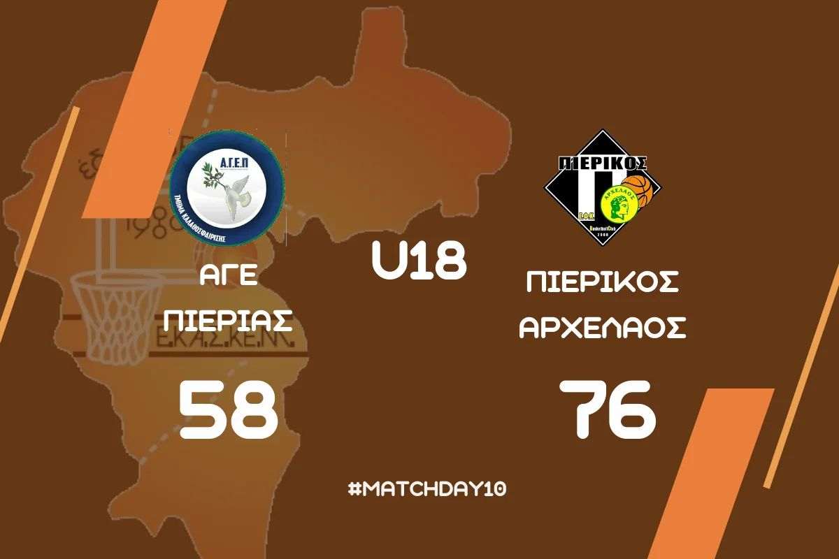 Ο Πιερικός Αρχέλαος επικράτησε με 58-76 της ΑΓΕ Πιερίας, στο Β’ Δημοτικό Αθλητικό Κέντρο Κατερίνης, σε αγώνα για τη 10η και τελευταία αγωνιστική του α’ ομίλου της α’ φάσης του πρωταθλήματος εφήβων της ΕΚΑΣΚΕΜ.