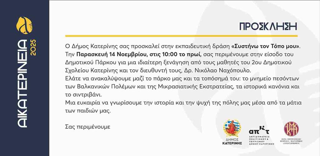 HomeΠΙΕΡΙΑΑΙΚΑΤΕΡΙΝΕΙΑ 2025: “Συστήνω τον τόπο μου” ΑΙΚΑΤΕΡΙΝΕΙΑ 2025: “Συστήνω τον τόπο μου” 11 Νοεμβρίου 202511 Νοεμβρίου 2025Ο Διάλογος – Την Παρασκευή 14 Νοεμβρίου & ώρα 10:00 π.μ. στην είσοδο του Δημοτικού Πάρκου Κατερίνης Ο ΔιάλογοςΟμάδα Σύνταξης at Ο Διάλογος | [email protected] | Website | + postsBio ⮌Ο Διάλογοςhttps://odialogos.gr/author/odialogos/Δέσμευση Κομισιόν σε Φαραντούρη για ανάκτηση κονδυλίων αν επιβεβαιωθεί κατασκοπεία της Τουρκίας Ο Διάλογοςhttps://odialogos.gr/author/odialogos/Επιστολή παραίτησης Κώστα Χασιώτη από μέλος του ΣΥΡΙΖΑ – ΠΣΟ Διάλογοςhttps://odialogos.gr/author/odialogos/Δικαστική δικαίωση για τη ΔΕΥΑ Κατερίνης με απόφαση του Διοικητικού ΕφετείουΟ Διάλογοςhttps://odialogos.gr/author/odialogos/ΑΚΚΕΛ: Το δράμα των κτηνοτρόφων δεν είναι θέαμα – είναι δική σας ευθύνη