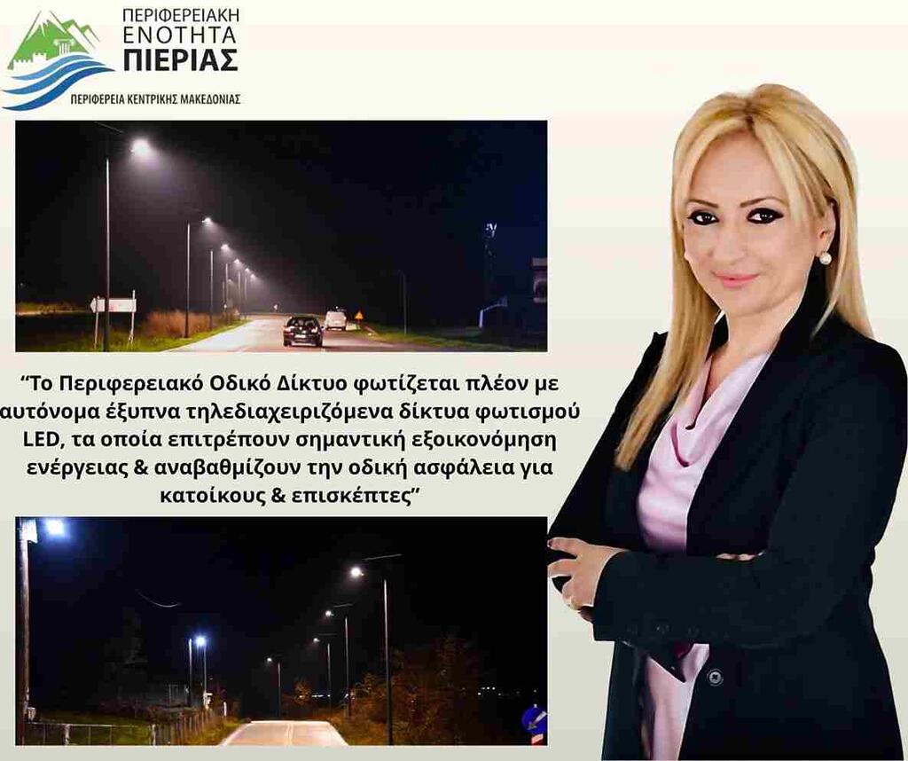 Συγκεκριμένα, στην Πιερία έχουν εγκατασταθεί αυτόνομα έξυπνα τηλεδιαχειριζόμενα δίκτυα φωτισμού με τη χρήση φωτιστικών σωμάτων και αισθητήρων, τα οποία δίνουν τη δυνατότητα προσαρμογής με βάση τις κατά περίπτωση ανάγκες (καιρικές συνθήκες, ώρες λειτουργίας, κατάσταση που συμβαίνει στην περιοχή φωτισμού κ.α). Το εν λόγω έργο είναι ιδιαιτέρως σημαντικό, καθώς ο έξυπνος φωτισμός επιτρέπει την αυξημένη ορατότητα και ασφάλεια στους οδηγούς και τους πεζούς, ιδίως σε σκοτεινές περιοχές, οι αυτόνομοι έξυπνοι φωτιστικοί στύλοι είναι σχεδιασμένοι για να εξοικονομούν ενέργεια μέσω της χρήσης LED τεχνολογίας και της δυνατότητας τηλεπροσαρμογής της φωτεινότητας σε πραγματικό χρόνο, ενώ ταυτόχρονα αναβαθμίζουν την εμφάνιση του οδικού δικτύου, προσδίδοντας αισθητική αξία στις περιοχές.