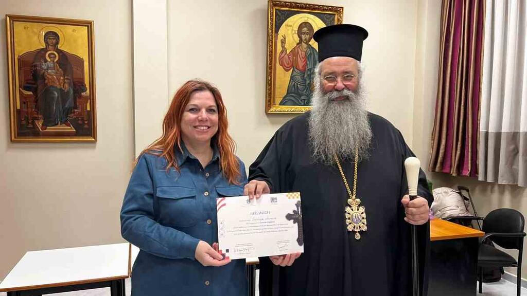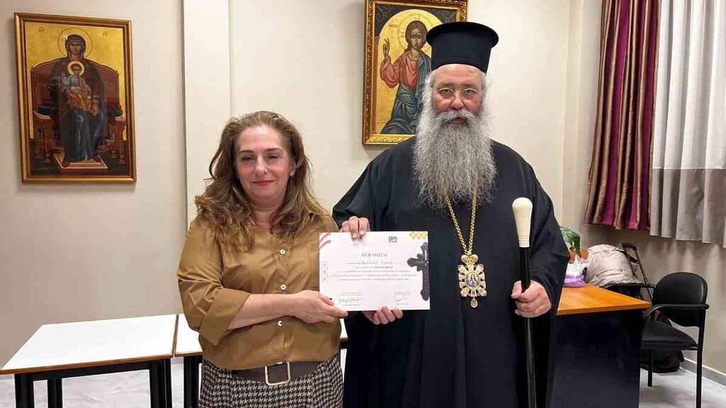 Κατά την ολοκλήρωση του σεμιναρίου, η Εκπαιδεύτρια κ. Δώρα Μαυροματίδου, εκ μέρους του Κέντρου Γραμμάτων και Τεχνών Δίου, προσέφερε στον Σεβασμιώτατο Μητροπολίτη κ. Γεώργιο ένα έργο ψηφιδωτού ως αναμνηστικό της συνεργασίας.