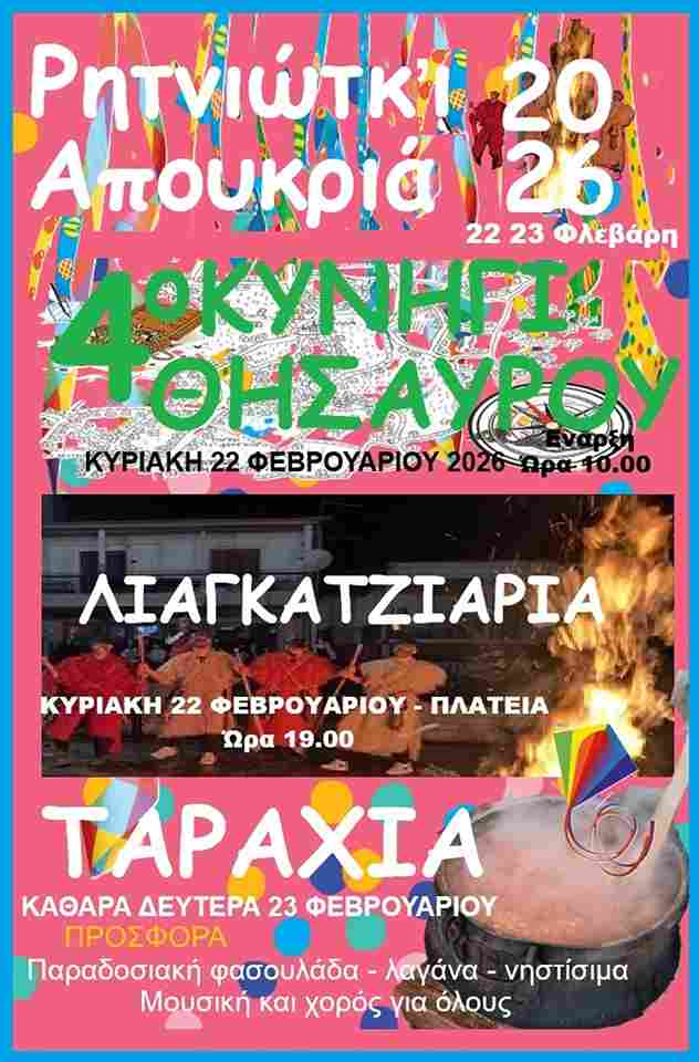 Την Κυριακή 22 Φεβρουαρίου 2026 με ώρα έναρξης 10.00, από το Πολιτιστικό Κέντρο «Πιερίδες Μούσες» Ρητίνης, ξεκινά το 4ο Κυνήγι του Κρυμμένου Θησαυρού Ρητίνης», μια επιτυχημένη διοργάνωση που στόχο έχει να δώσει ζωή στο χωριό, να διατηρήσει και να αναδείξει το τοπικό γλωσσικό ιδίωμα. Είναι ένα παιχνίδι για μικρούς και μεγάλους που ακολουθώντας την διαδρομή της ανακάλυψης του θησαυρού, έρχονται σε επαφή με τους κατοίκους του χωριού, μαθαίνουν την τοπική παράδοση, τοπικές ιστορίες, μύθους, τοποθεσίες, γνωρίζουν το τοπικό γλωσσικό ιδίωμα της Ρητίνης.
