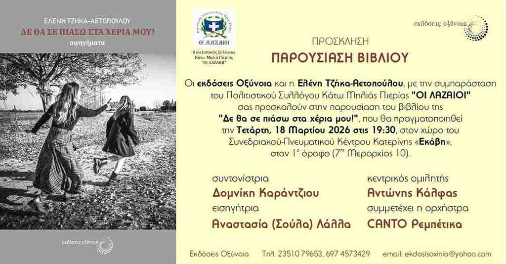 Οι εκδόσεις Οξύνοια και η Ελένη Τζήκα – Αετοπούλου, με την συμπαράσταση του Πολιτιστικού Συλλόγου Κάτω Μηλιάς Πιερίας «Οι Λαζαίοι», σας προσκαλούν στην παρουσίαση του βιβλίου της «Δεν θα σε πιάσω στα χέρια μου!», που θα πραγματοποιηθεί την Τετάρτη, 18 Μαρτίου 2026 στις 19:30 στο χώρο του Συνεδριακού – Πνευματικού Κέντρου «Εκάβη», στον 1ο όροφο.