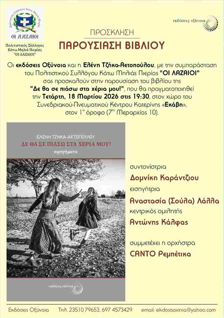 Οι εκδόσεις Οξύνοια και η Ελένη Τζήκα – Αετοπούλου, με την συμπαράσταση του Πολιτιστικού Συλλόγου Κάτω Μηλιάς Πιερίας «Οι Λαζαίοι», σας προσκαλούν στην παρουσίαση του βιβλίου της «Δεν θα σε πιάσω στα χέρια μου!», που θα πραγματοποιηθεί την Τετάρτη, 18 Μαρτίου 2026 στις 19:30 στο χώρο του Συνεδριακού – Πνευματικού Κέντρου «Εκάβη», στον 1ο όροφο.