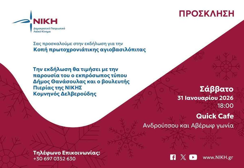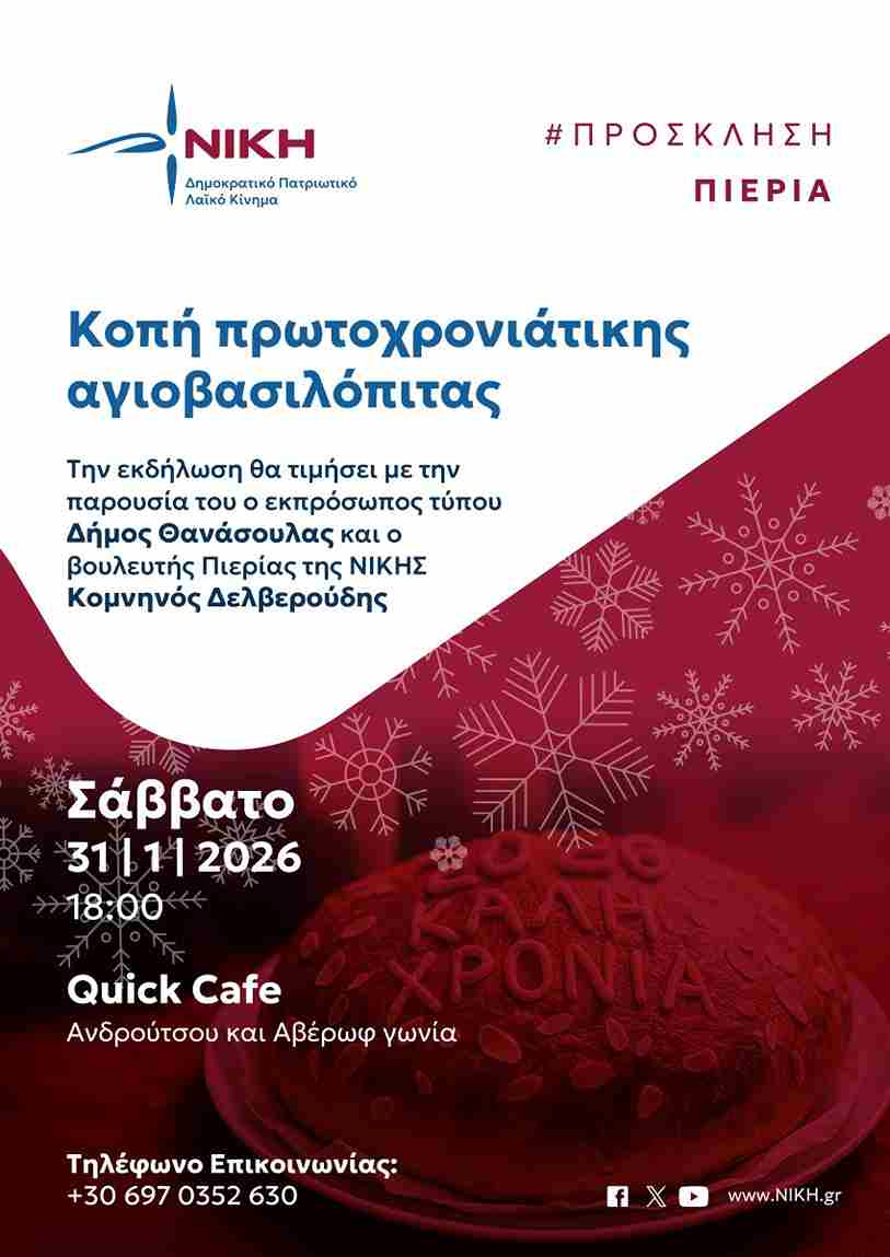 Σας προσκαλούμε στην εκδήλωση για την Κοπή της Πρωτοχρονιάτικης Αγιοβασιλόπιτας, που θα πραγματοποιηθεί το Σάββατο 31 Ιανουαρίου 2026, ώρα 18:00, στο Quick Cafe (γωνία Ανδρούτσου και Αβέρωφ).