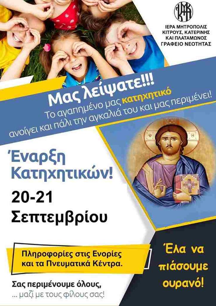 Η Ιερά Μητρόπολη Κίτρους, Κατερίνης και Πλαταμώνος ανακοινώνει την έναρξη των Κατηχητικών Συνάξεων για το νέο εκκλησιαστικό έτος.