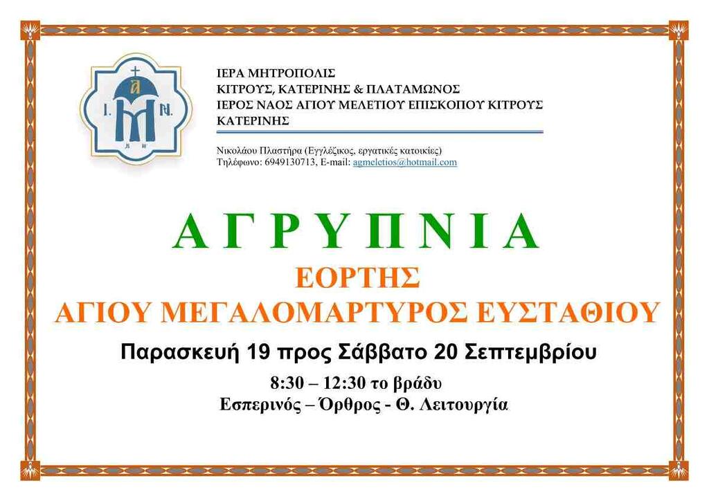 HomeΠΙΕΡΙΑΕΚΚΛΗΣΙΑΣΤΙΚΑΑγρυπνία εορτής Αγίου Μεγαλομάρτυρος Ευσταθίου Αγρυπνία εορτής Αγίου Μεγαλομάρτυρος Ευσταθίου 15 Σεπτεμβρίου 202515 Σεπτεμβρίου 2025Ο Διάλογος Την Παρασκευή 19 Σεπτεμβρίου 2025,στον Ιερό Ναό Αγίου Μελετίου Κατερίνης Ο ΔιάλογοςΟμάδα Σύνταξης at Ο Διάλογος | [email protected] | Website | + postsBio ⮌Ο Διάλογοςhttps://odialogos.gr/author/odialogos/Ο Μητροπολίτης Γεώργιος αποδοκιμάζει το Halloween: «Λυπηρή Παραφωνία» στην Εθνική ΕπέτειοΟ Διάλογοςhttps://odialogos.gr/author/odialogos/Νίκος Καζαντζίδης: Σεβασμός στους γύρω μας και στον εαυτό μαςΟ Διάλογοςhttps://odialogos.gr/author/odialogos/Αικατερίνεια 2025: «UNDER 30» – Ο Νοέμβριος της τέχνης & του πολιτισμού ξεκινάΟ Διάλογοςhttps://odialogos.gr/author/odialogos/ΑΙΚΑΤΕΡΙΝΕΙΑ 2025 – Εκδήλωση γευσιγνωσίας ελαιολάδου