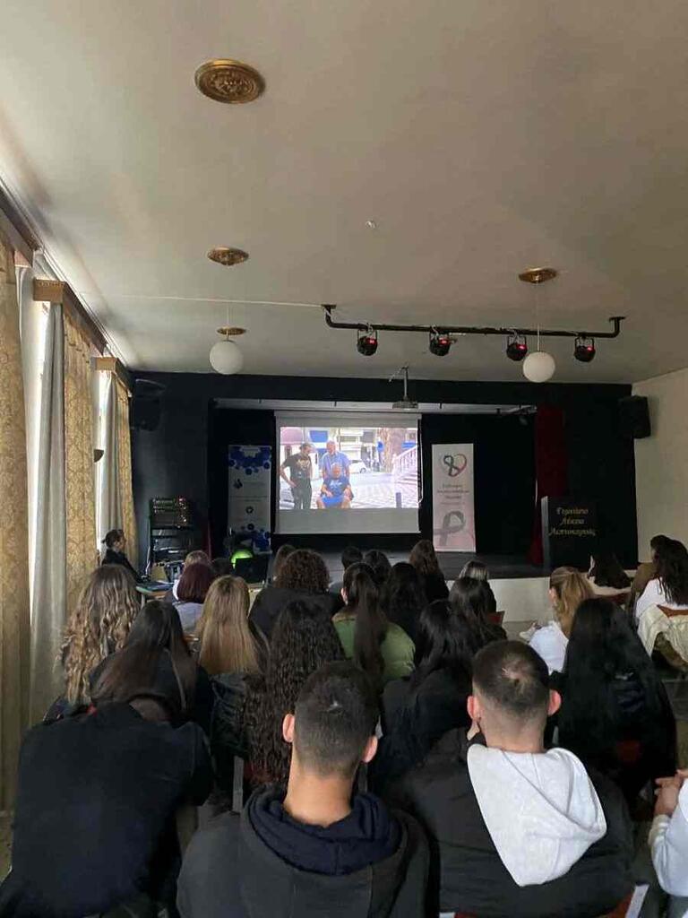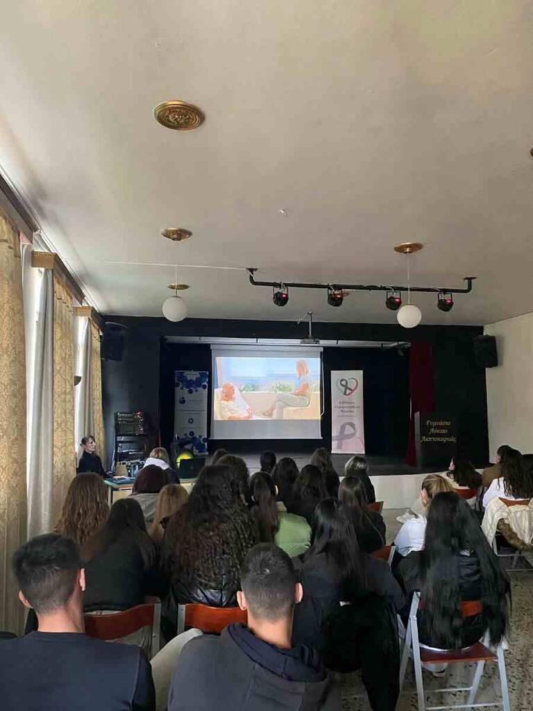 Η Πρόεδρος του Συλλόγου, κ. Ράνια Καραμήτσιου, με τη συμμετοχή του Γραμματέα κ. Γκανά παρουσίασε στην πρώτη ενότητα, το πρόγραμμα «Κανονικές Ζωές – Όταν ο καρκίνος συναντά την ανθρώπινη δύναμη» το οποίο υλοποιείται σε συνεργασία με την Περιφερειακή Ενότητα Πιερίας. Αναλύθηκε η σημασία της άσκησης και της σωστής διατροφής ως βασικά μέσα πρόληψης κατά του καρκίνου και αναδείχθηκε η ψυχοκοινωνική διάσταση της νόσου, εστιάζοντας στο πώς ο κοινωνικός περίγυρος μπορεί να στηρίξει ουσιαστικά τον ασθενή στη μάχη για την ίαση. Επίσης προβλήθηκε η ταινία «Κανονικές Ζωές» παραγωγής του Συλλόγου Καρκινοπαθών Πιερίας η οποία συγκίνησε βαθύτατα τους μαθητές, μεταφέροντας το μήνυμα ότι η ανθρώπινη δύναμη και η αλληλεγγύη μπορούν να νικήσουν τον φόβο.