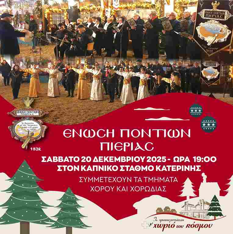 Η Ένωση Ποντίων Πιερίας για μία ακόμη χρόνιά με χαρά συμμετέχει, στο ευγενικό κάλεσμα της Εθελοντικής Ομάδας Δράσης Ν. Πιερίας, στις εκδηλώσεις του Χριστουγεννιάτικου Χωριού του Κόσμου το Σάββατο 20 Δεκεμβρίου ώρα 7:00 μ.μ. στον Καπνικό Σταθμό Κατερίνης, με τα τμήματα Χορού, Χορωδίας του συλλόγου.