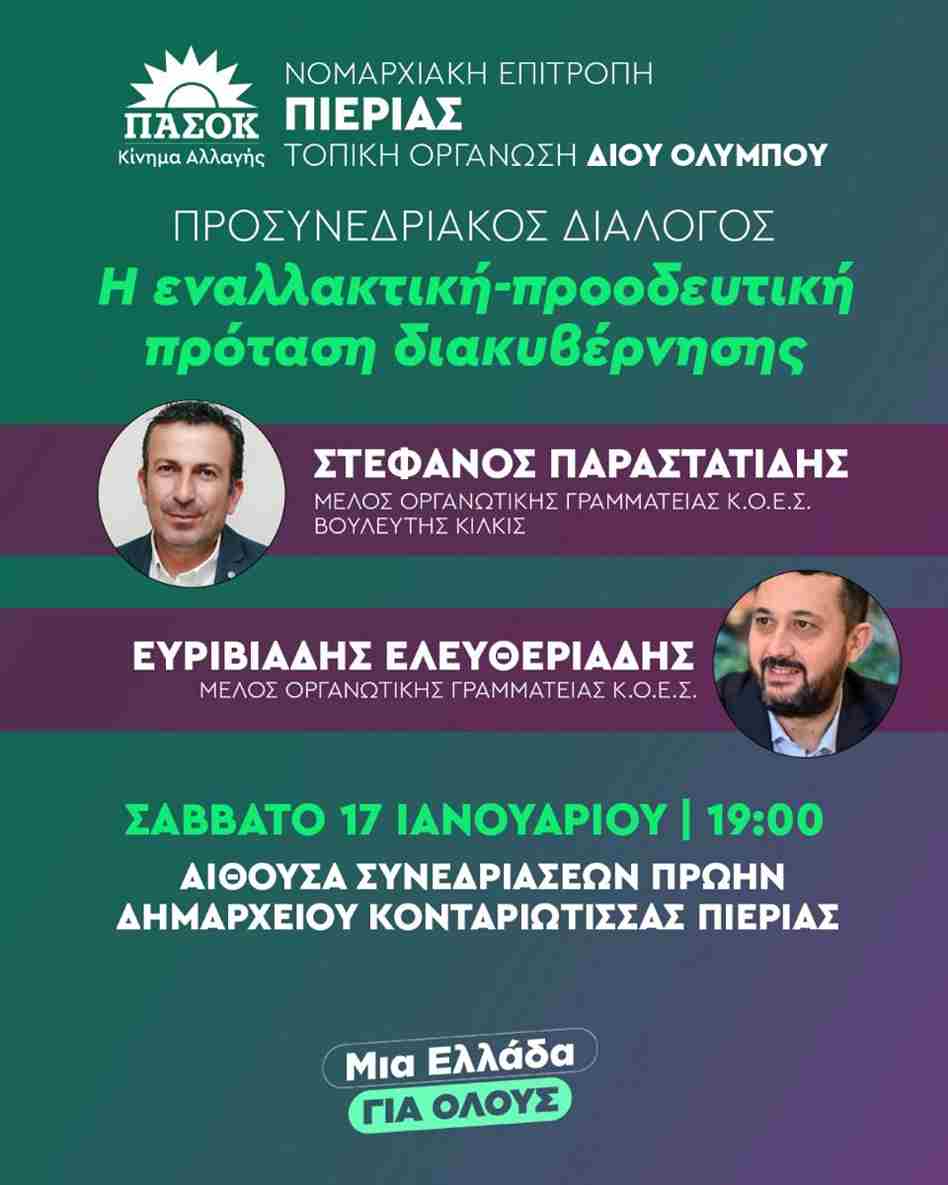 Πολιτική εκδήλωση της Ν.Ε. Πιερίας και της Τ.Ο. Δίου-Ολύμπού, του ΠΑΣΟΚ, για τον προσυνεδριακό διάλογο του Κινήματος μας, πραγματοποιείται το επόμενο Σάββατο 17/1/2026 και ώρα 7μμ, στην αίθουσα συνεδριάσεων του δημοτικού καταστήματος στην Κονταριώτισσα.