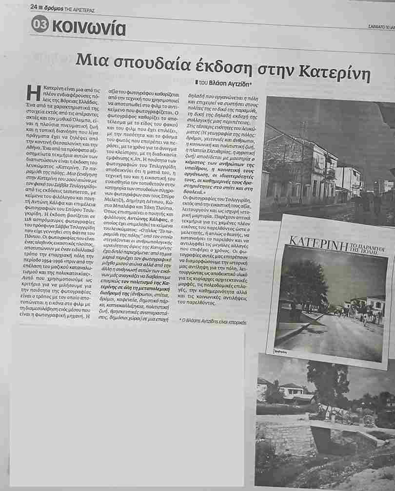 Το λεύκωμα με την επιμέλεια του φιλόλογου-ποιητή Αντώνη Κάλφα -που εκδόθηκε στην Κατερίνη με φωτογραφίες του Σάββα Τσιλιγγιρίδη, ενός παλιού και πολύ σημαντικού φωτογράφου- δείχνει την ποιότητα που βρίσκεις στη λεγόμενη “ελληνική επαρχία “, που λίγο πολύ έχει ξεχαστεί από την αδηφαγία της Αθήνας ή της Θεσσαλονίκης.