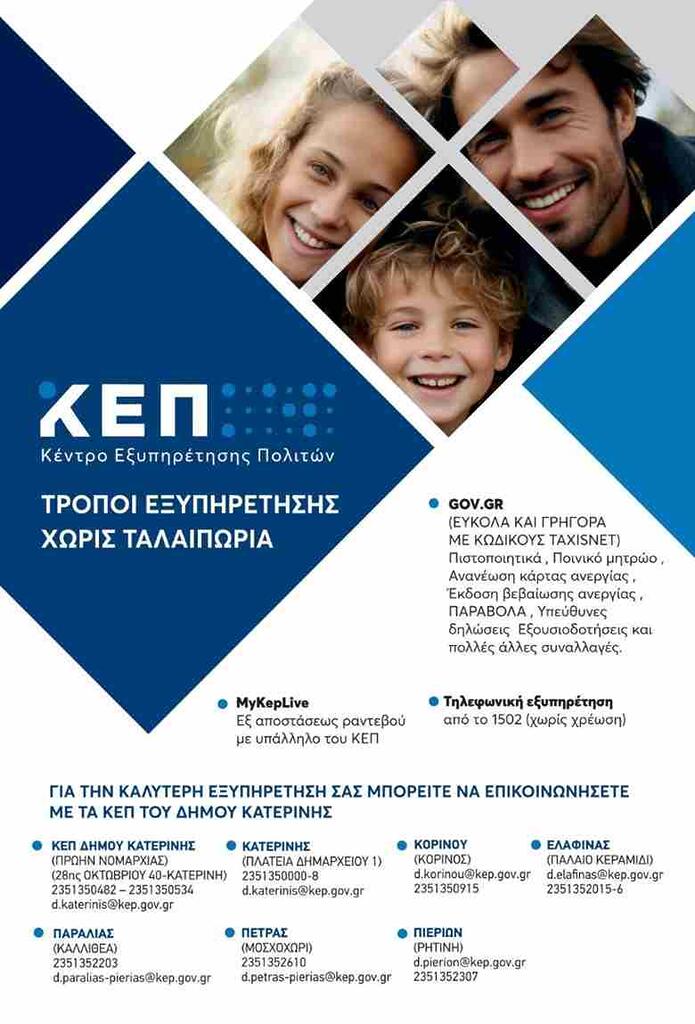 Στην έκδοση και κυκλοφορία ενός νέου χρηστικού εντύπου, με στόχο την αναλυτική ενημέρωση των δημοτών για τους σύγχρονους τρόπους εξυπηρέτησης από το ΚΕΠ, χωρίς ταλαιπωρία και άσκοπες μετακινήσεις προχώρησε η Αντιδημαρχία Διοικητικών Υπηρεσιών του Δήμου Κατερίνης.