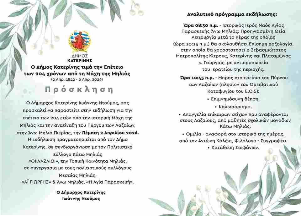 HomeΠΙΕΡΙΑΟ Δήμος Κατερίνης τιμά την Επέτειο των 204 χρόνων από τη Μάχη της Μηλιάς/Πρόσκληση – Πρόγραμμα Ο Δήμος Κατερίνης τιμά την Επέτειο των 204 χρόνων από τη Μάχη της Μηλιάς/Πρόσκληση – Πρόγραμμα 24 Μαρτίου 202624 Μαρτίου 2026Ο Διάλογος Ο ΔιάλογοςΟμάδα Σύνταξης at Ο Διάλογος | [email protected] | Website | + postsBio ⮌Ο ΔιάλογοςΑιμοδοσία Συλλόγου Εκπαιδευτικών Πρωτοβάθμιας Εκπαίδευσης Ν. Πιερίας Ο ΔιάλογοςΗ «ευρωπαϊκή αλληλεγγύη» στην Κύπρο και η «Ρήτρα Αμοιβαίας Συνδρομής»Ο ΔιάλογοςΗ «αναγέννηση» της Αστικής Σχολής ακόμη αναζητείταιΟ ΔιάλογοςΑΚΚΕΛ: Η αλήθεια για τις εξελίξεις στη Μυτιλήνη