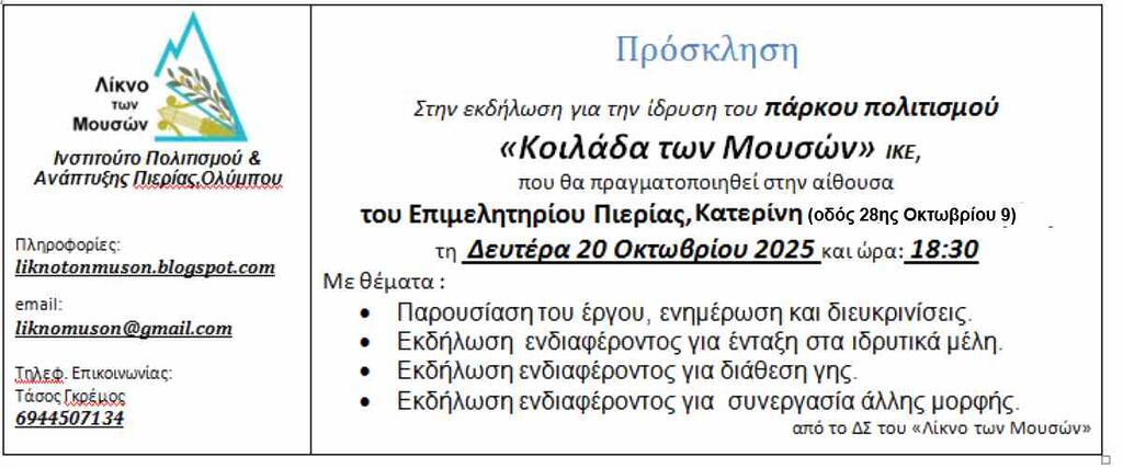 Πρόσκληση στην ενημερωτική εκδήλωση για όλους, την Δευτέρα 20 Οκτωβρίου 2025, ώρα 18.30 στο Επιμελητήριο Πιερίας.