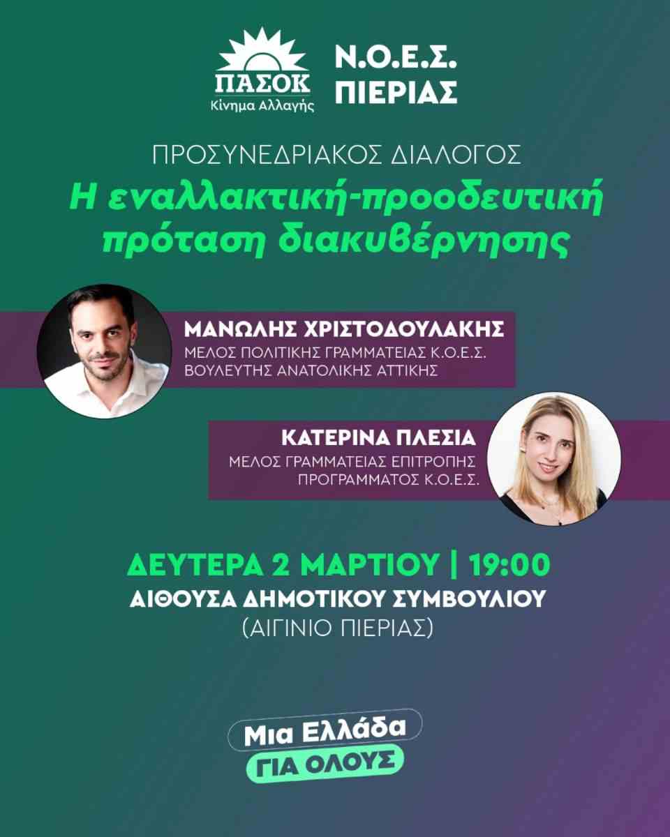 Την Δευτέρα 2 Μαρτίου 2026 και ώρα 19.00 στην αίθουσα του Δημοτικού Συμβουλίου (Δημαρχείο) στο Αιγίνιο η Ν.Ο.Ε.Σ. Πιερίας του ΠΑΣΟΚ οργανώνει μια ακόμη εκδήλωση προσυνεδριακού διαλόγου με θέμα “Η εναλλακτική – προοδευτική πρόταση διακυβέρνησης. Συμμετέχουν: