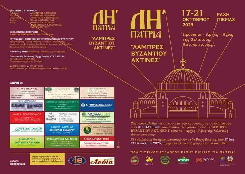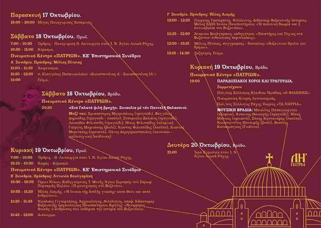 Σας προσκαλούμε να τιμήσετε με την παρουσία σας τις εκδηλώσεις των ΛΗ΄ ΠΑΤΡΙΩΝ, των οποίων το αφιέρωμα είναι «ΛΑΜΠΡΕΣ ΒΥΖΑΝΤΙΟΥ ΑΚΤΙΝΕΣ∙ Πρόσωπα – Αρχές – Αξίες της Χιλιετούς Αυτοκρατορίας».