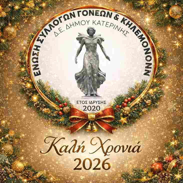 Η Ένωση Συλλόγων Γονέων και Κηδεμόνων Δ.Ε. Δήμου Κατερίνης εύχεται σε ολόκληρη την εκπαιδευτική κοινότητα του Δήμου μας, το νέο έτος να φέρει υγεία, πρόοδο, δημιουργικότητα και συνεργασία.