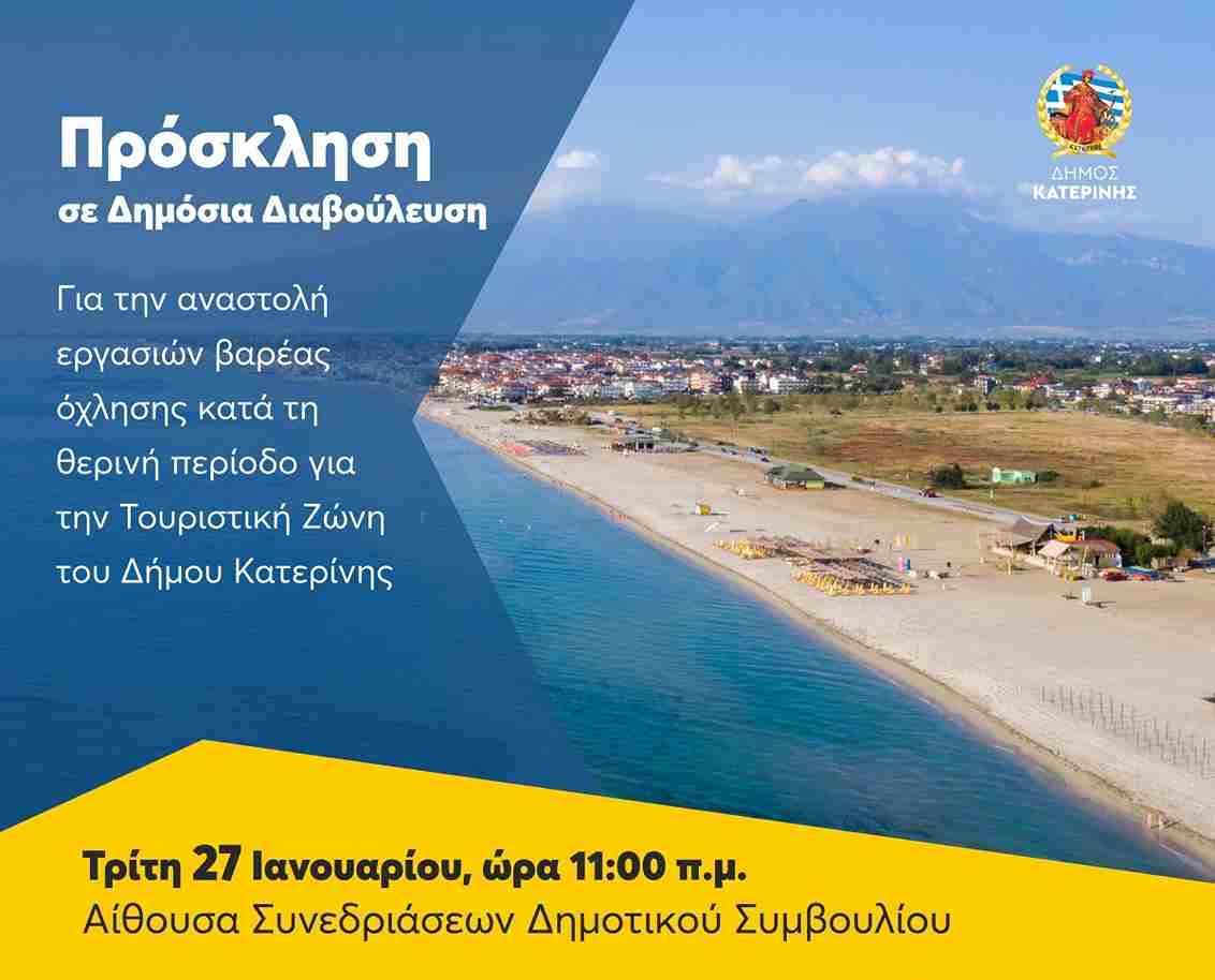 Καλούμε τους εκπροσώπους όλων των εμπλεκομένων φορέων στον κλάδο του Τουρισμού και των Κατασκευαστικών (οικοδομικές εργασίες κ.ά.), καθώς και των Εμπορικών Συλλόγων να προσέλθουν στην αίθουσα Συνεδριάσεων Δημοτικού Συμβουλίου, την Τρίτη 27/01/2026 και ώρα 11:00 π.μ. προκειμένου να συμμετέχουν στη διαβούλευση που θα πραγματοποιηθεί, καταθέτοντας προφορικά και εγγράφως τις απόψεις τους.