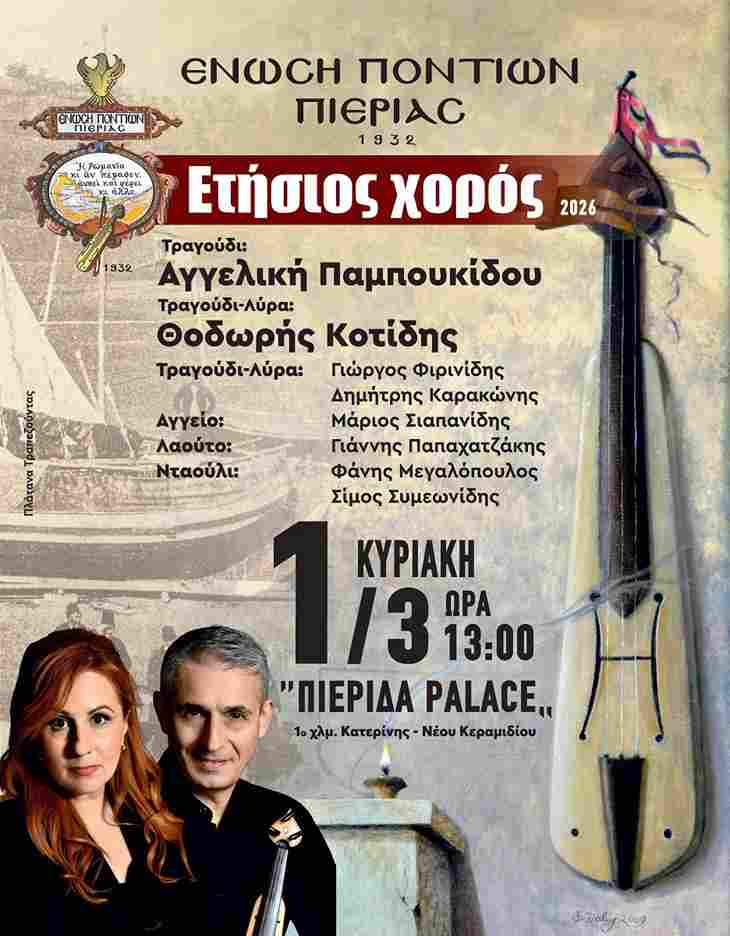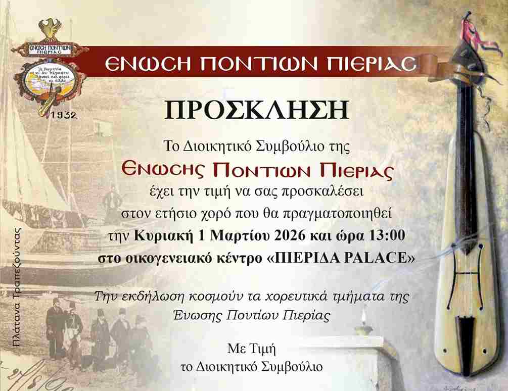 Η Ένωση Ποντίων Πιερίας έχει την τιμή και την χαρά να σας προσκαλέσει στον ετήσιο χορό που θα πραγματοποιηθεί την Κυριακή 1η Μαρτίου 2026 και ώρα 13:00 στο οικογενειακό κέντρο ¨ΠΙΕΡΙΔΑ PALACE¨