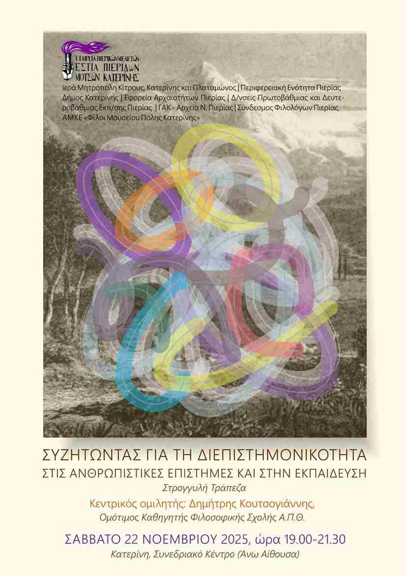 Η Εταιρεία Πιερικών Μελετών «Εστία Πιερίδων Μουσών Κατερίνης» σε συνεργασία με την Ιερά Μητρόπολη Κίτρους, Κατερίνης και Πλαταμώνος, την Περιφέρεια Κεντρικής Μακεδονίας-Περιφερειακή Ενότητα Πιερίας, τον Δήμο Κατερίνης, την Εφορεία Αρχαιοτήτων Πιερίας, τις Διευθύνσεις Πρωτοβάθμιας και Δευτεροβάθμιας Εκπαίδευσης Πιερίας, τα ΓΑΚ – Αρχεία Ν. Πιερίας, τον Σύνδεσμο Φιλολόγων Πιερίας και την ΑΜΚΕ «Φίλοι Μουσείου Πόλης Κατερίνης» οργανώνει στρογγυλή τράπεζα με τίτλο: «Συζητώντας για τη διεπιστημονικότητα στις ανθρωπιστικές επιστήμες και στην εκπαίδευση» το Σάββατο 22 Νοεμβρίου 2025 και ώρα 19.00-21.30 στο Συνεδριακό Κέντρο Κατερίνης (Άνω Αίθουσα).