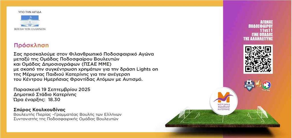 Σας προσκαλούμε στον Φιλανθρωπικό Ποδοσφαιρικό Αγώνα μεταξύ της Ομάδας Ποδοσφαίρου Βουλευτών και Ομάδας Δημοσιογράφων (ΠΣΑΕ ΜΜΕ) με σκοπό την συγκέντρωση χρημάτων για την δράση Lights on της Μέριμνας Παιδιού Κατερίνης για την ανέγερση του Κέντρου Ημερήσιας Φροντίδας Ατόμων με Αυτισμό.