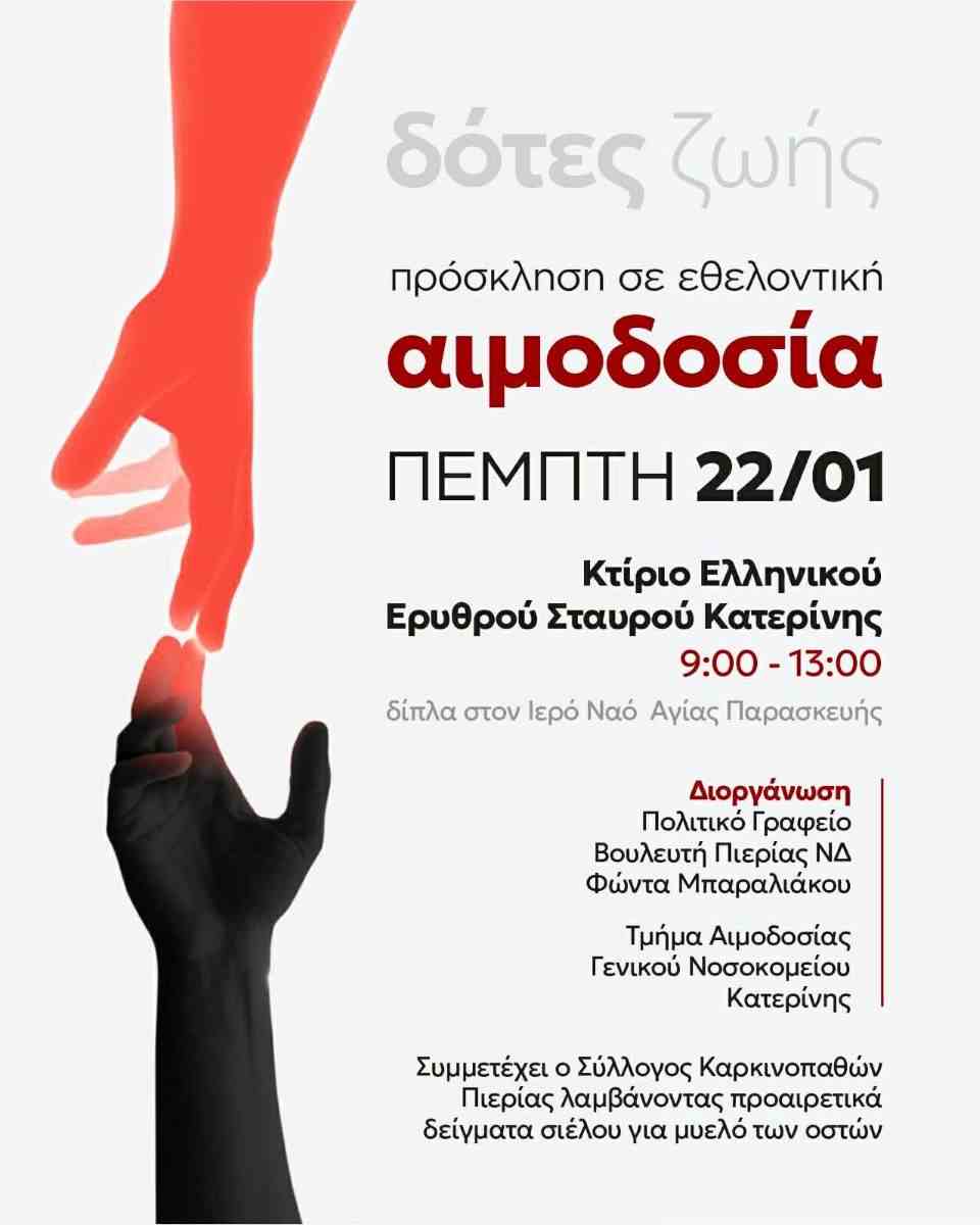 Η αιμοδοσία θα διεξαχθεί από τις 9:00 έως τις 13:00, στο Κτίριο του Ελληνικού Ερυθρού Σταυρού Κατερίνης, δίπλα στον Ιερό Ναό Αγίας Παρασκευής, με στόχο την ενίσχυση των αποθεμάτων αίματος του Γενικού Νοσοκομείου Κατερίνης.